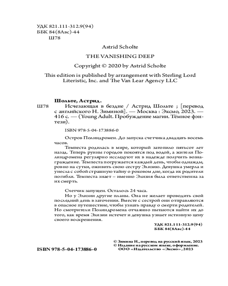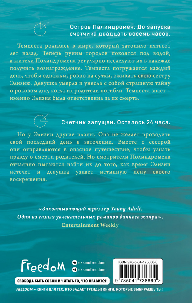 В данный момент этот товар отсутствует в продаже. Возможно, у нас найдется аналогичный или похожий товар здесь. Серия: Young Adult. Пробуждение магии. Тёмное фэнтези Остров Палиндромен. До запуска счетчика двадцать восемь часов. Темпест родилась в мире, который затопило пятьсот лет назад. Теперь руины городов покоятся под водой, а жители Полиндромена регулярно исследуют их в надежде получить вознаграждение. Темпест погружается каждый день, чтобы однажды, ровно на сутки, оживить свою сестру Элизию. Девушка умерла и унесла с собой страшную тайну о роковом дне, когда их родители погибли. Темпест знает — именно Элизия была ответственна за их смерть.