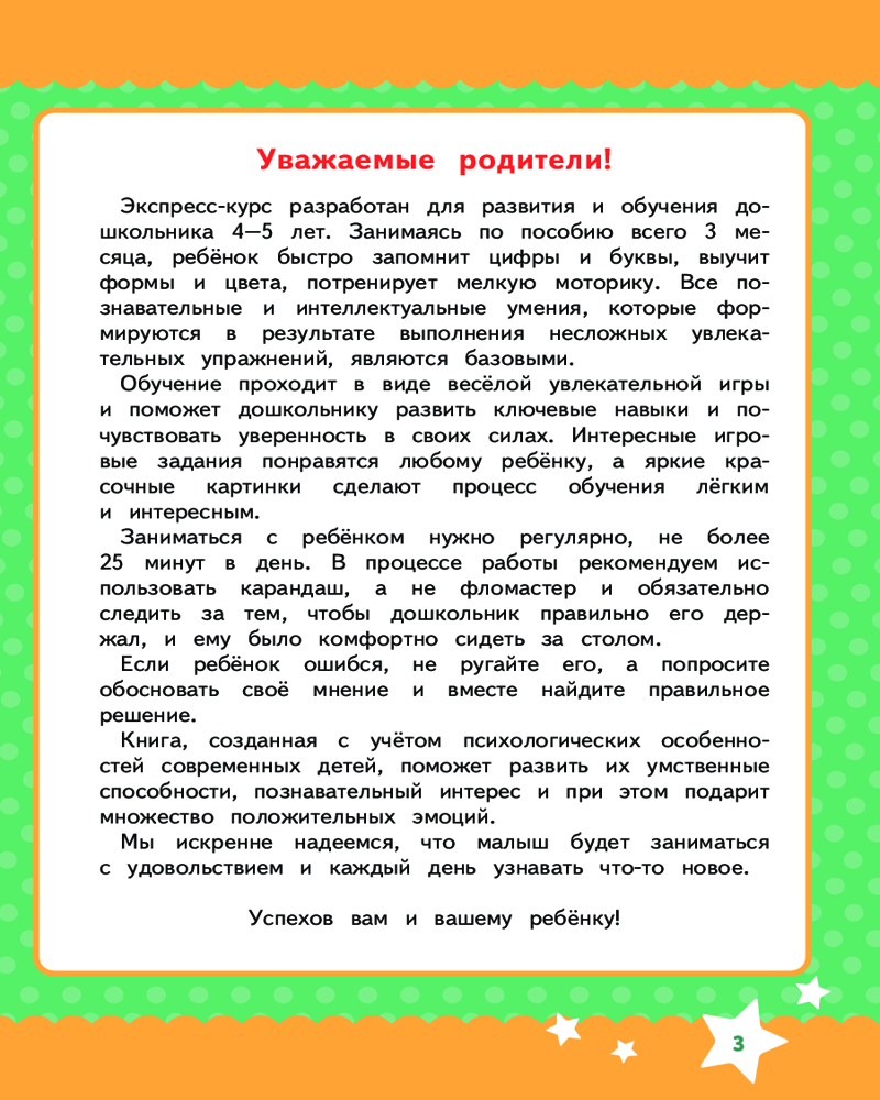 💳 Оплатить за товар можно при получении 🇰🇿 Есть бесплатная доставка по Казахстану от 1 дня 🎁 Копите бонусы с каждой покупки Серия: Ускоренное развитие. Годовой курс за три месяца Экспресс-курс разработан для развития и обучения дошкольника. Занимаясь, ребенок быстро запомнит цифры и буквы, выучит формы и цвета, потренирует мелкую моторику. Все познавательные и интеллектуальные умения, которые формируются в результате выполнения несложных увлекательных упражнений, являются базовыми. Интересные игровые задания понравятся любому ребенку, а яркие красочные картинки сделают процесс обучения легким и интересным. |