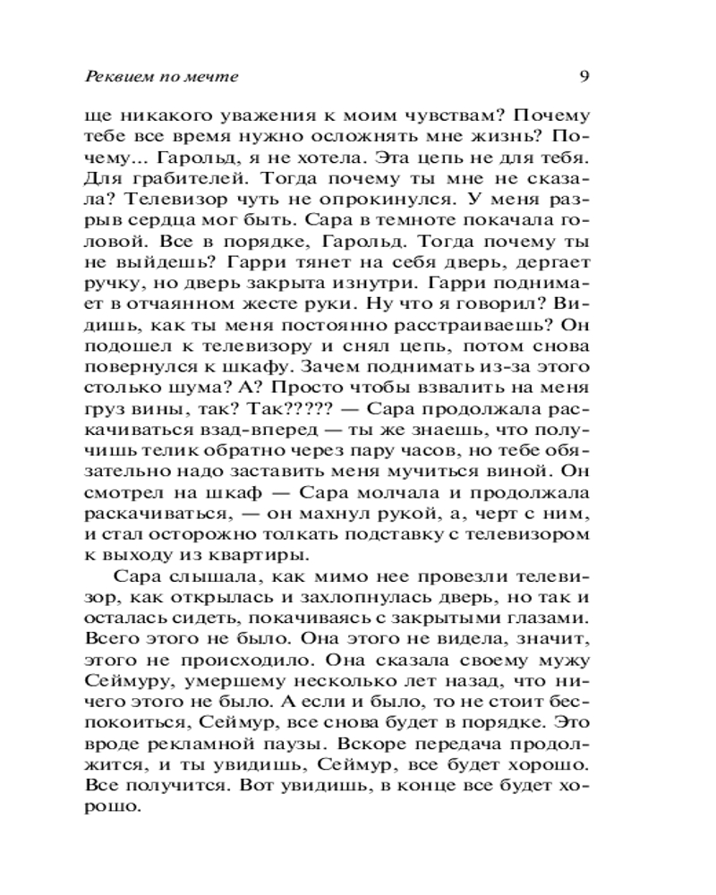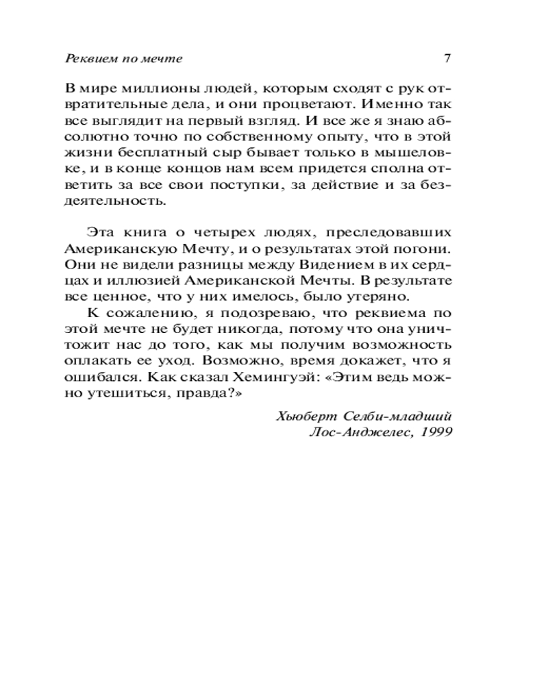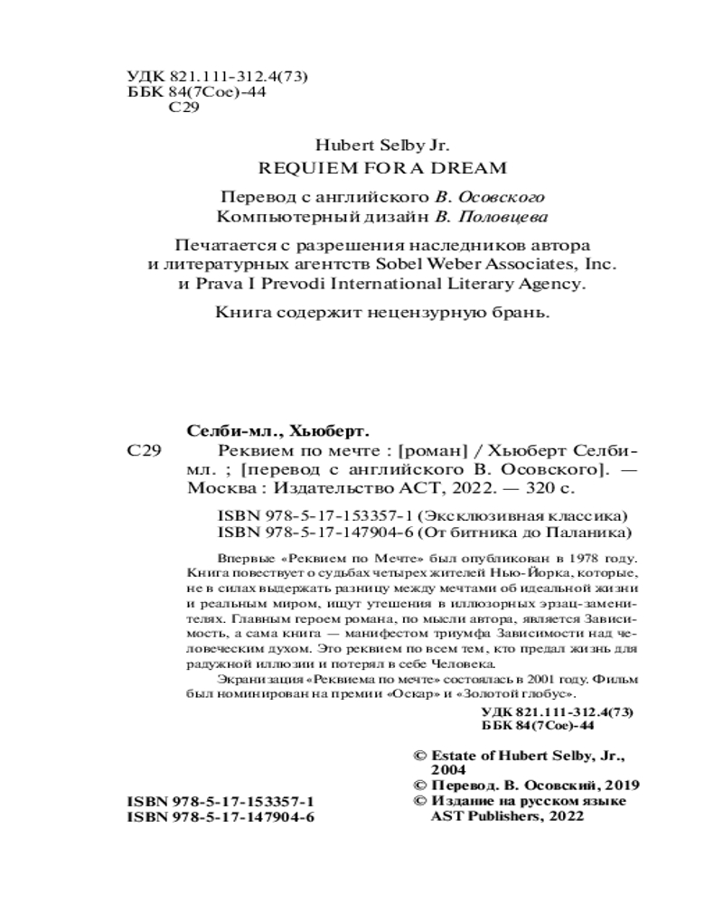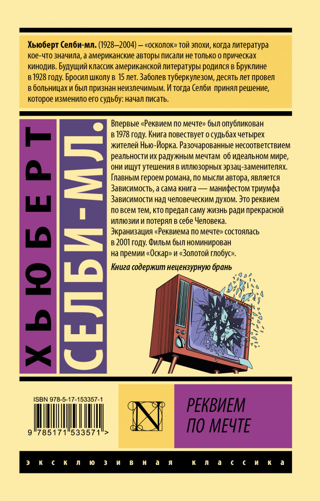 💳 Оплатить за товар можно при получении 🇰🇿 Есть бесплатная доставка по Казахстану от 1 дня 🎁 Копите бонусы с каждой покупки Серия: Эксклюзивная классика Впервые «Реквием по Мечте» был опубликован в 1978 году. Книга повествует о судьбах четырех жителей Нью-Йорка, которые, не в силах выдержать разницу между мечтами об идеальной жизни и реальным миром, ищут утешения в иллюзорных эрзац-заменителях. Главным героем романа, по мысли автора, является Зависимость, а сама книга — манифестом триумфа Зависимости над человеческим духом. Это реквием по всем тем, кто предал жизнь для радужной иллюзии и потерял в себе Человека. |