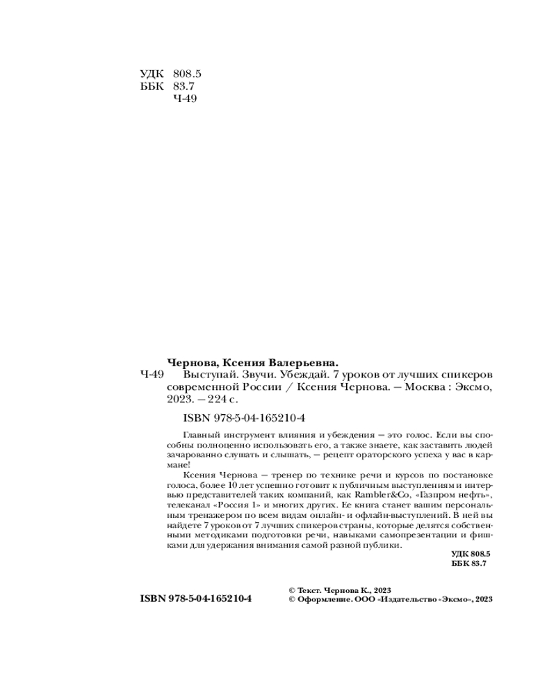 Выступай. Звучи. Убеждай. 7 уроков от лучших спикеров современной РоссииВ данный момент этот товар отсутствует в продаже. Возможно, у нас найдется аналогичный или похожий товар здесь. Серия: Top Speaker. Говори так, чтобы тебя слушали Главный инструмент влияния и убеждения — это голос. Если вы способны полноценно использовать его, а также знаете, как заставить людей зачарованно слушать и слышать, — рецепт ораторского успеха у вас в кармане! |