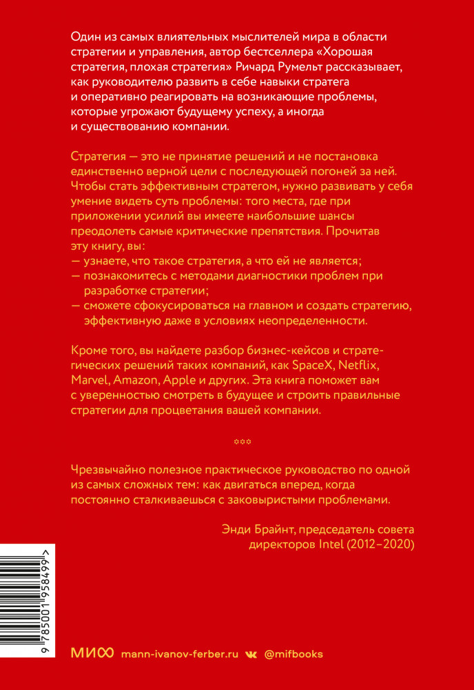 Взлом стратегии. Начните с главного и получите результатВ данный момент этот товар отсутствует в продаже. Возможно, у нас найдется аналогичный или похожий товар здесь. Серия: Мировые бизнес-стратегии. Книги для тех, кто держит на плечах компанию Ричард Румельт — один из самых влиятельных мыслителей мира в области стратегии и управления, автор бестселлера «Хорошая стратегия, плохая стратегия» — рассказывает, как руководителю развить в себе навыки стратега и оперативно реагировать на проблемы, угрожающие будущему успеху, а иногда и существованию компании. |