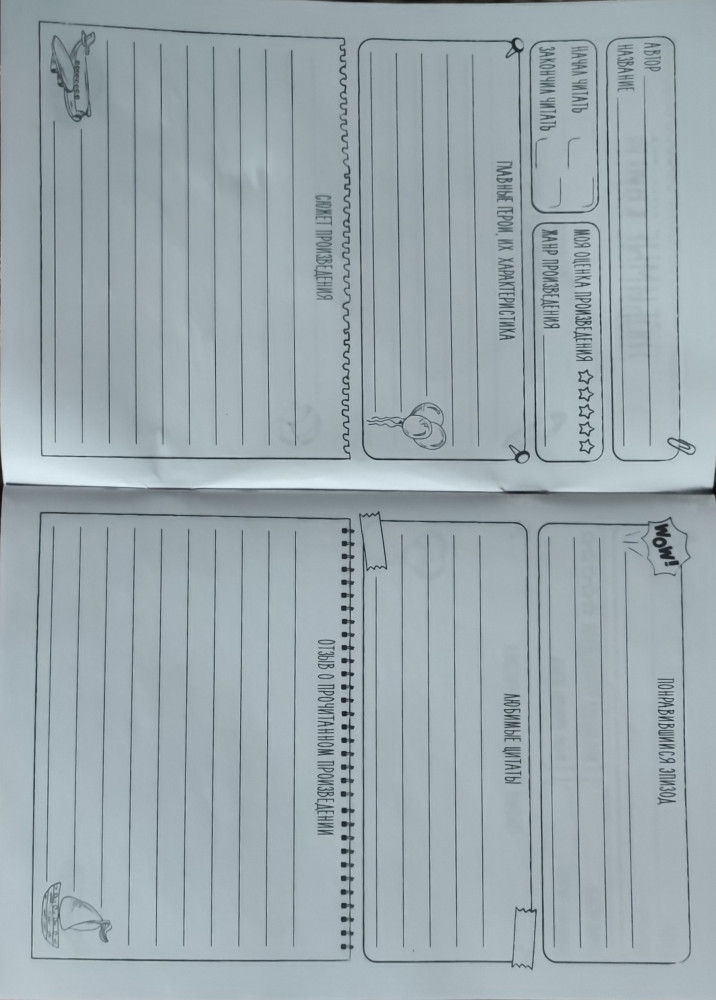 отличный дневник, по прекрасной цене. взяли для стимула больше читать летом. 7л ребенку. сам сразу сел заполнять. очень много страниц. одна страничка любимых книг, остальные все со строками автор, сюжет и тд (см фото). в конце ещё одна страница.