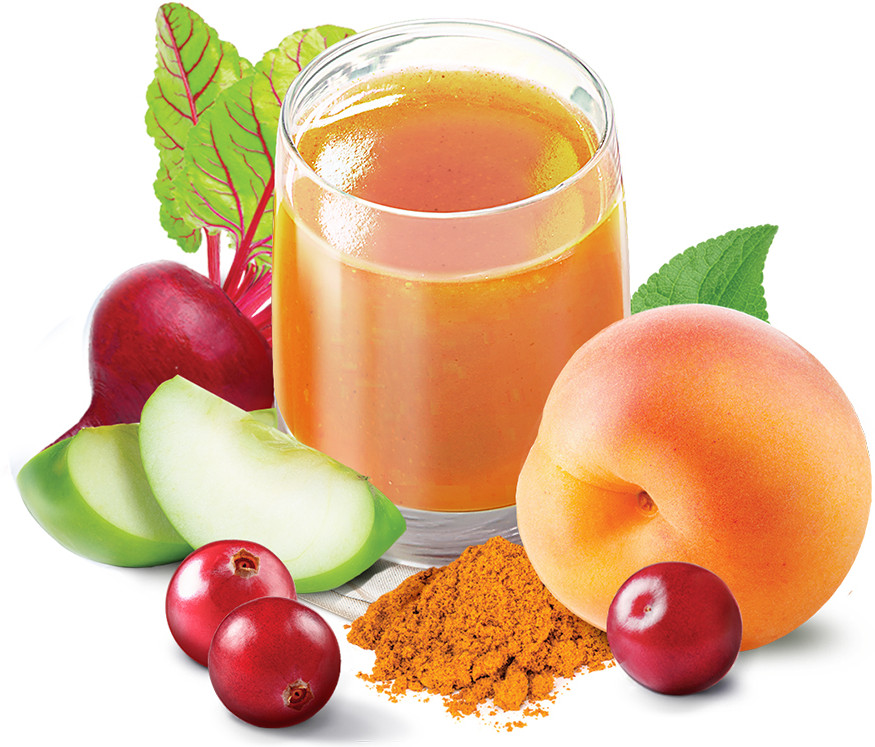 • способствует детоксикации и улучшают пищеварение: яблоко, абрикос, куркума, свекла, витамины С, В12;