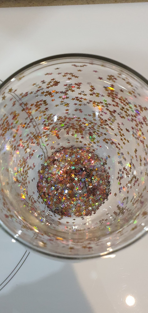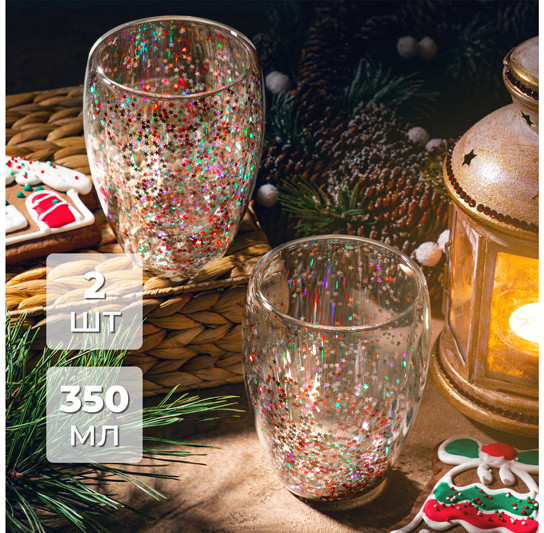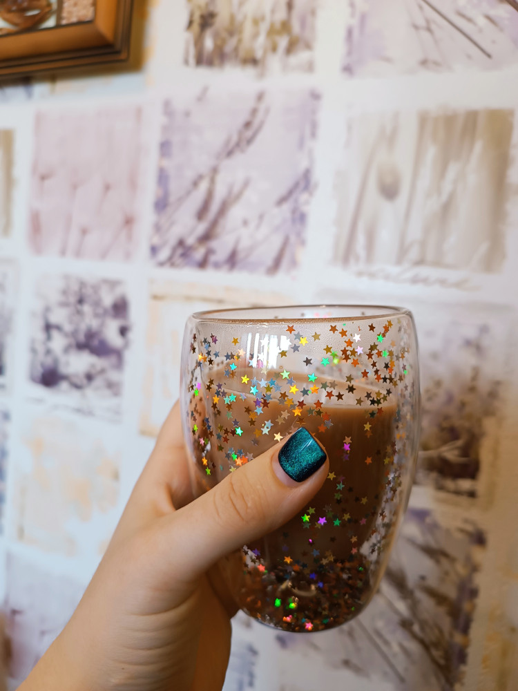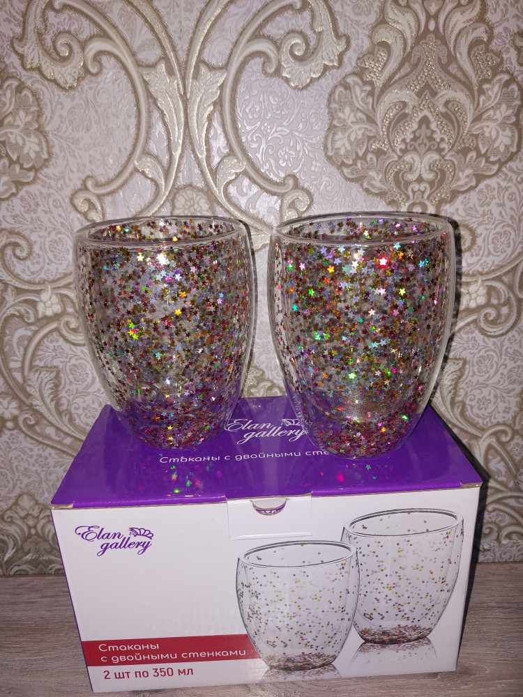дополняю отзыв спустя пару дней использования бокалов. Звёздочки со стенок упали все на дно стакана. Некоторые склеились между собой в один комок и теперь некрасиво болтаются. Лучше покупать такие же термо-бокалы, но без мешуры, просто прозрачные. Т.к. эта красота на один раз.