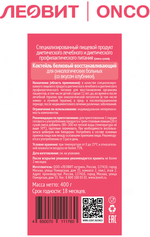 Леовит ONCO Коктейль белковый для онкологических больных восстанавливающий со вкусом клубники