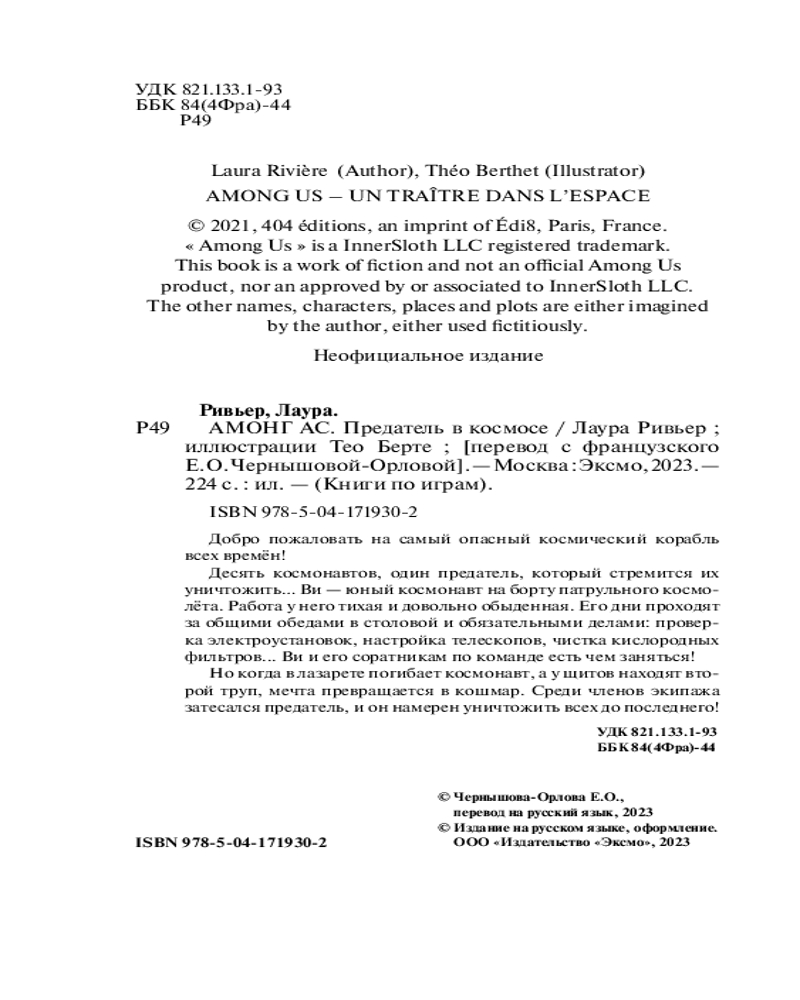 💳 Оплатить за товар можно при получении 🇰🇿 Есть бесплатная доставка по Казахстану от 1 дня 🎁 Копите бонусы с каждой покупки Серия: Детск. Книги по играм Книга по игре «Амонг Ас»! Действие происходит, как и в игре, на космическом корабле. История о том, как участники космической экспедиции вычисляют предателя. На корабле в открытом космосе неизвестная болезнь поражает одного за другим участников экспедиции. Наверное, один из них — носитель вируса и предатель. Но как его вычислить?.. Приключения, загадка, неожиданный финал! |
