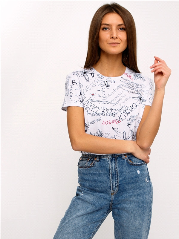 Интересный необычный принт, есть даже строки из стихов)) Окружающим будет, что почитать)). Крой свободный, ткань приятная к телу.