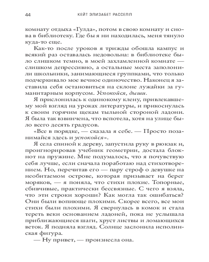 | Кейт Элизабет Расселл — американская писательница. Кейт родилась и выросла на востоке штата Мэн. Она имеет степень магистра иностранных дел Университета Индианы и докторскую степень Университета Канзаса. Свой первый роман Моя темная Ванесса Кейт издала в 2020 году. Книга стала национальным бестселлером, получила положительные отзывы в ряде публикаций. Ее выбрали для перевода и публикации в 22 странах. Роман также планируется к экранизации. Писательницу обвинили в плагиате, после чего Кейт... |
