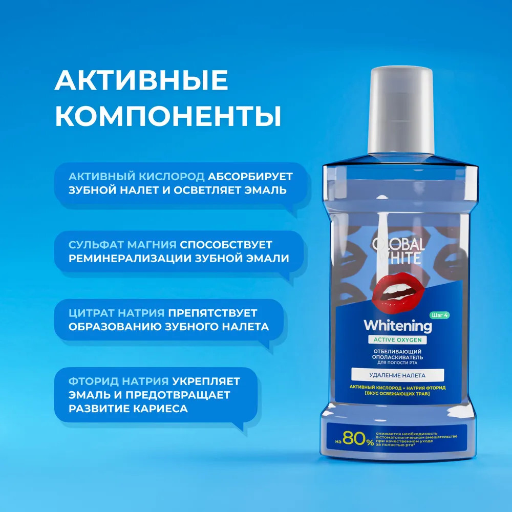 Global White Ополаскиватель для полости ртаВ данный момент этот товар отсутствует в продаже. Возможно, у нас найдется аналогичный или похожий товар здесь. Необходимым средством ухода за полостью рта в течение дня является отбеливающий ополаскиватель. Это прекрасное дополнение к ежедневной гигиене, помогающее отбелить зубы в труднодоступных участках полости рта. Благодаря активному кислороду отбеливание происходит не только на поверхности эмали, но и в более глубоких ее слоях. |
