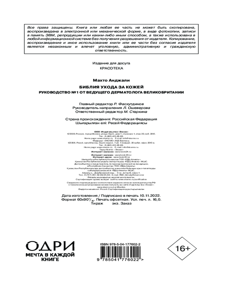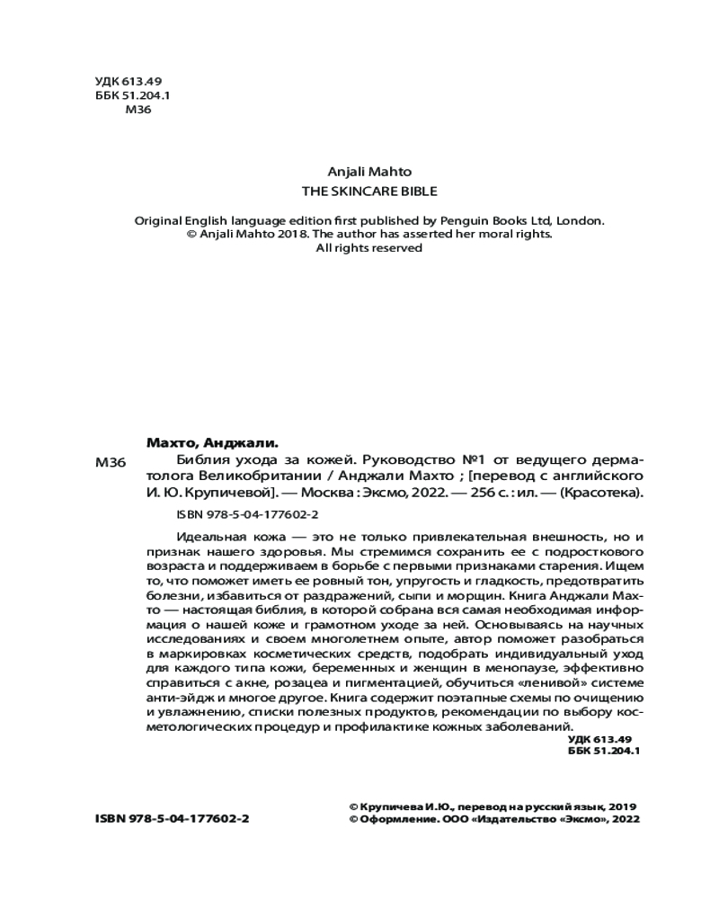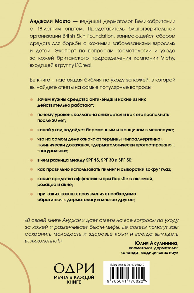 «В своей книге Анджали дает ответы на все вопросы по уходу за кожей и развенчивает бьюти-мифы. Ее советы помогут вам сохранить молодость и здоровье кожи и всегда выглядеть великолепно!» — Юлия Акулинина, косметолог-дерматолог, кандидат медицинских наук |