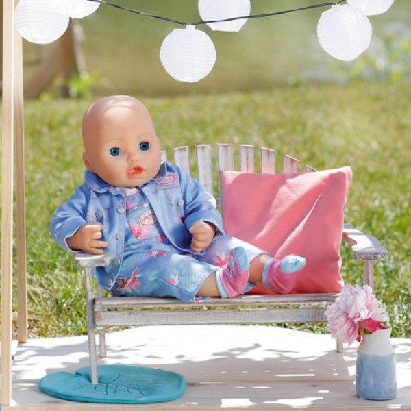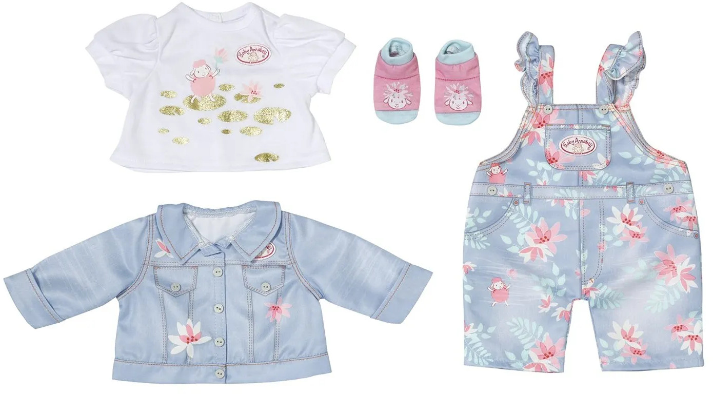Например, этот чудесный наряд для самой настоящей модницы! Он состоит из джинсовой курточки, джинсового комбинезона, белой футболки с рисунком и носочков. Выглядит очень стильно! Девочка с удовольствием нарядит свою куколку в новый наряд и будет весело играть.