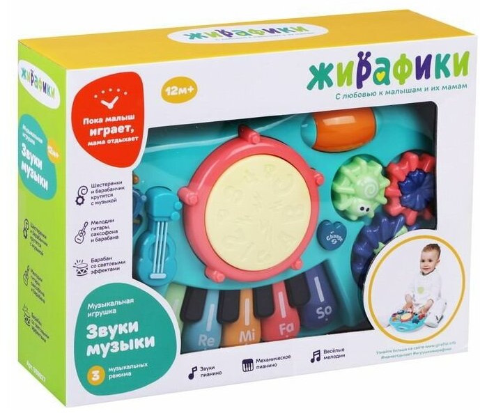 Жирафики Игрушка музыкальная «Звуки музыки»В данный момент этот товар отсутствует в продаже. Возможно, у нас найдется аналогичный или похожий товар здесь. С веселой игрушкой «Звуки музыки» малыш отправится в настоящее музыкальное приключение: в режиме по умолчанию можно нажимать на клавиши пианино и слушать, как звучат различные нотки. Если переключить режим, то при нажатии клавиш из нот будет складываться прекрасная музыка (для переключения режимов используйте кнопку-сердечко). А если переключить режим еще раз, то можно услышать ритмичные композиции и даже потанцевать! |