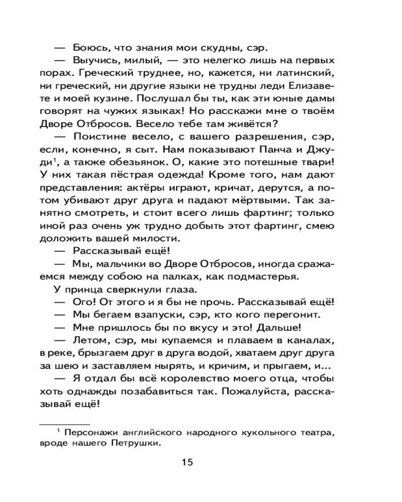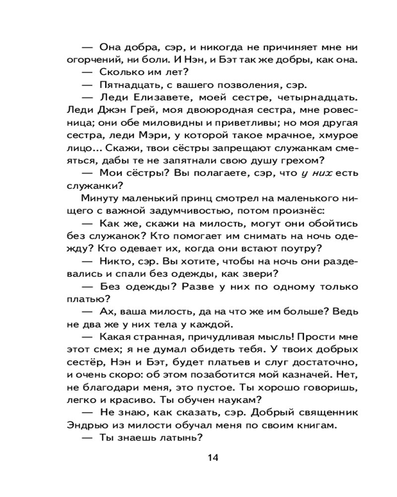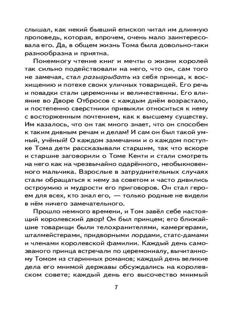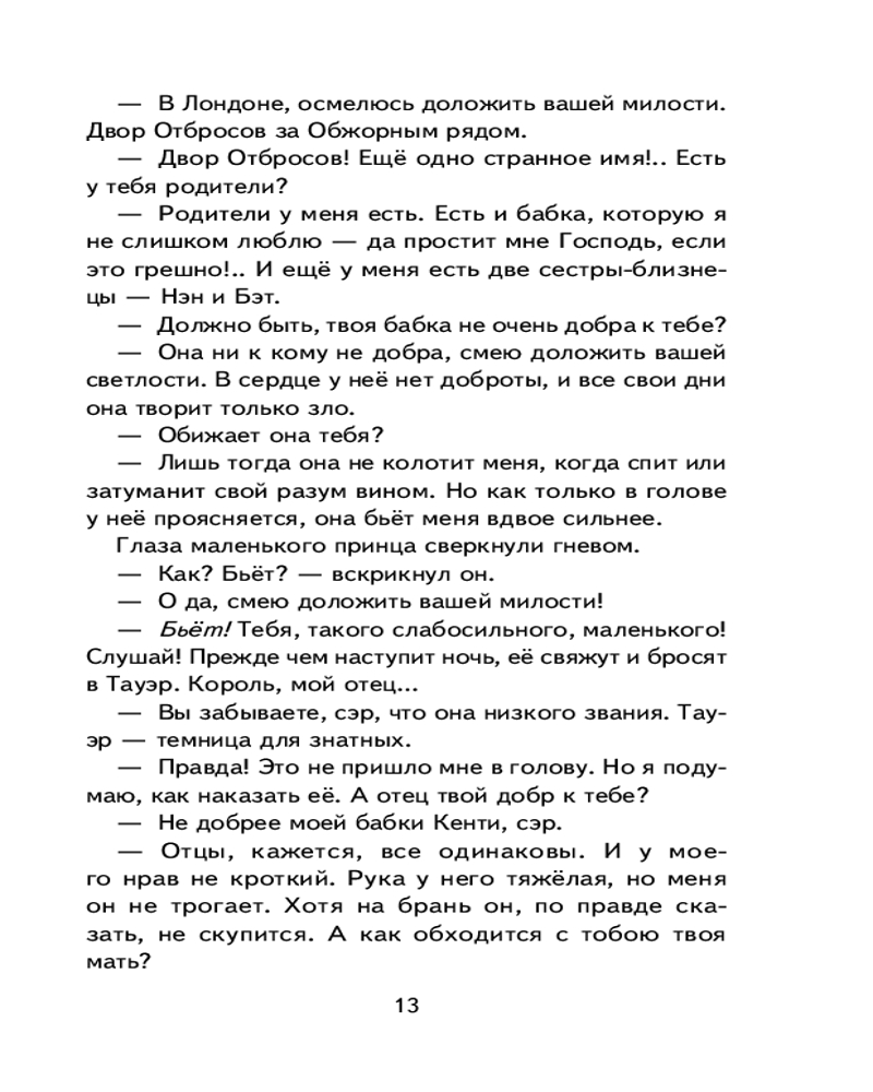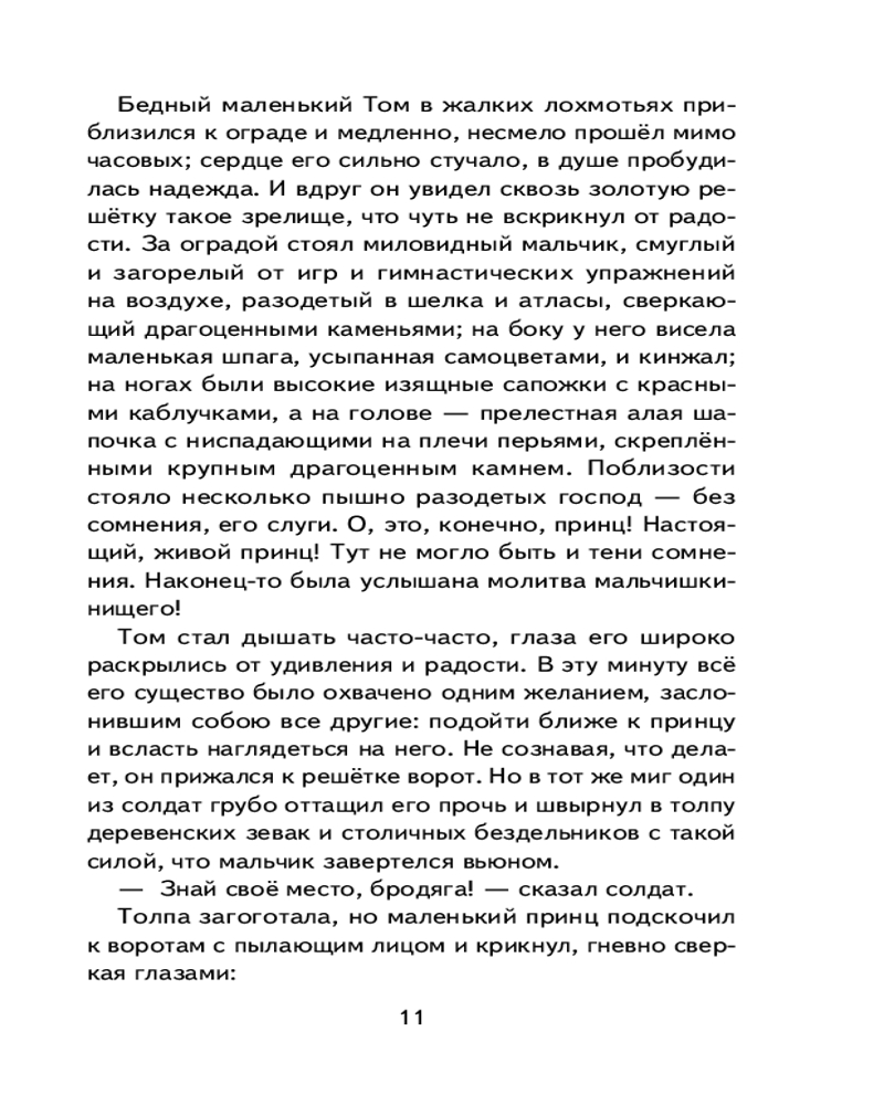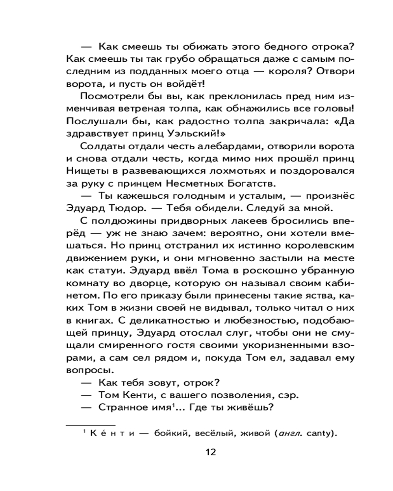 💳 Оплатить за товар можно при получении 🇰🇿 Есть бесплатная доставка по Казахстану от 1 дня 🎁 Копите бонусы с каждой покупки Серия: Книги для внеклассного чтения Жизнь порой преподносит удивительные сюрпризы. Ещё вчера Том Кенти, сын самого обычного бедняка из Двора Отбросов, засыпал голодный на охапке соломы, а сегодня он — принц Англии, наследник королевского престола. Как же такое могло случиться? Случай свёл двух похожих друг на друга мальчиков с разными судьбами, чтобы проверить, кто достойно пройдёт выпавшие испытания, а кого ослепит тщеславие и гордость. |
