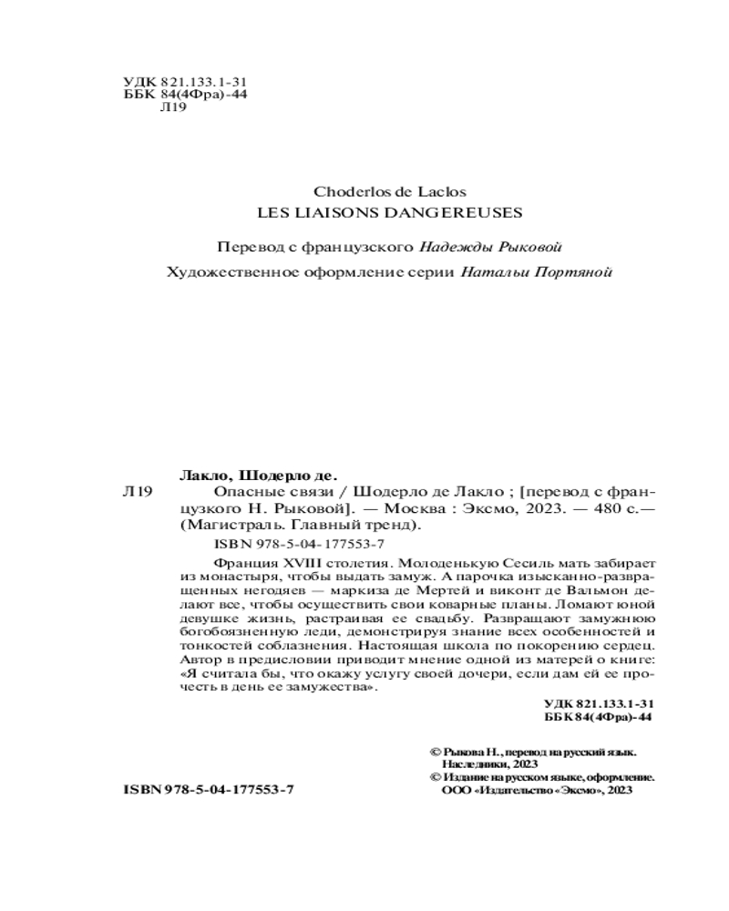 💳 Оплатить за товар можно при получении 🇰🇿 Есть бесплатная доставка по Казахстану от 1 дня 🎁 Копите бонусы с каждой покупки Серия: Магистраль. Главный тренд Страсть, соблазн, месть, тайны, желания — это все «Опасные связи». Франция XVIII столетия. Молоденькую Сесиль мать забирает из монастыря, чтобы выдать замуж. А парочка изысканно-развращенных негодяев — маркиза де Мертей и виконт де Вальмон — делают все, чтобы осуществить свои коварные планы. Ломают юной девушке жизнь, расстраивая ее свадьбу. Развращают замужнюю богобоязненную леди, демонстрируя знание всех особенностей и тонкостей соблазнения. |