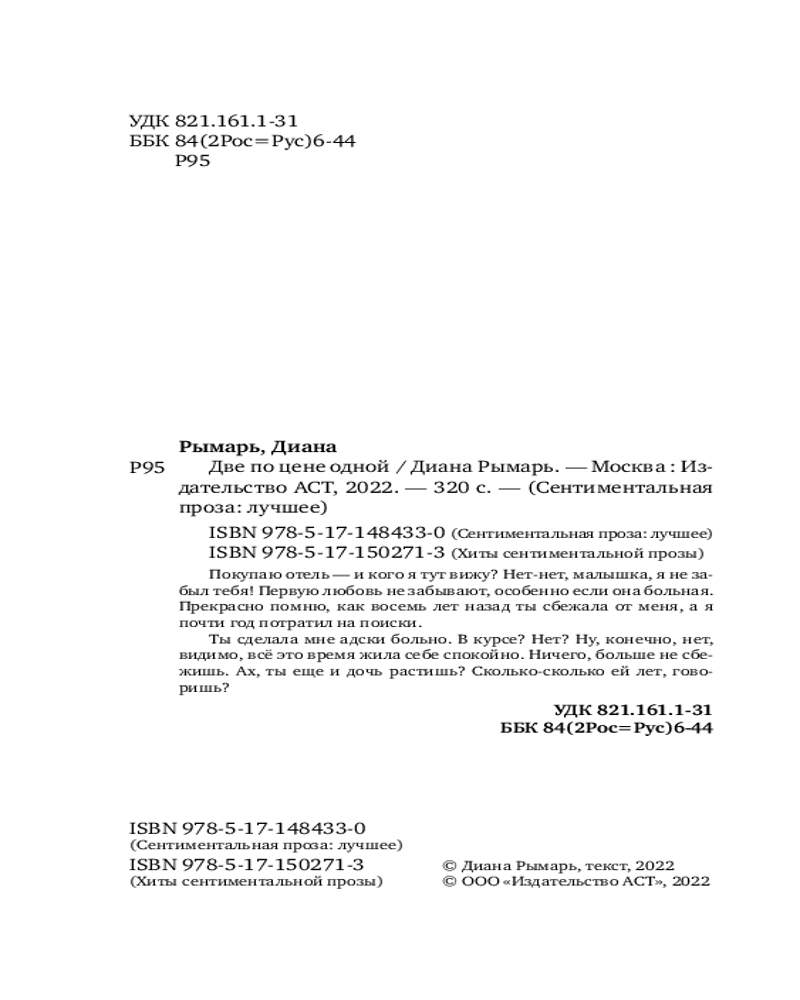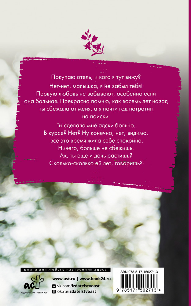 Две по цене однойВ данный момент этот товар отсутствует в продаже. Возможно, у нас найдется аналогичный или похожий товар здесь. Серия: Хиты сентиментальной прозы Покупаю отель — и кого я тут вижу? Нет-нет, малышка, я не забыл тебя! Первую любовь не забывают, особенно если она больная. Прекрасно помню, как восемь лет назад ты сбежала от меня, а я почти год потратил на поиски. |