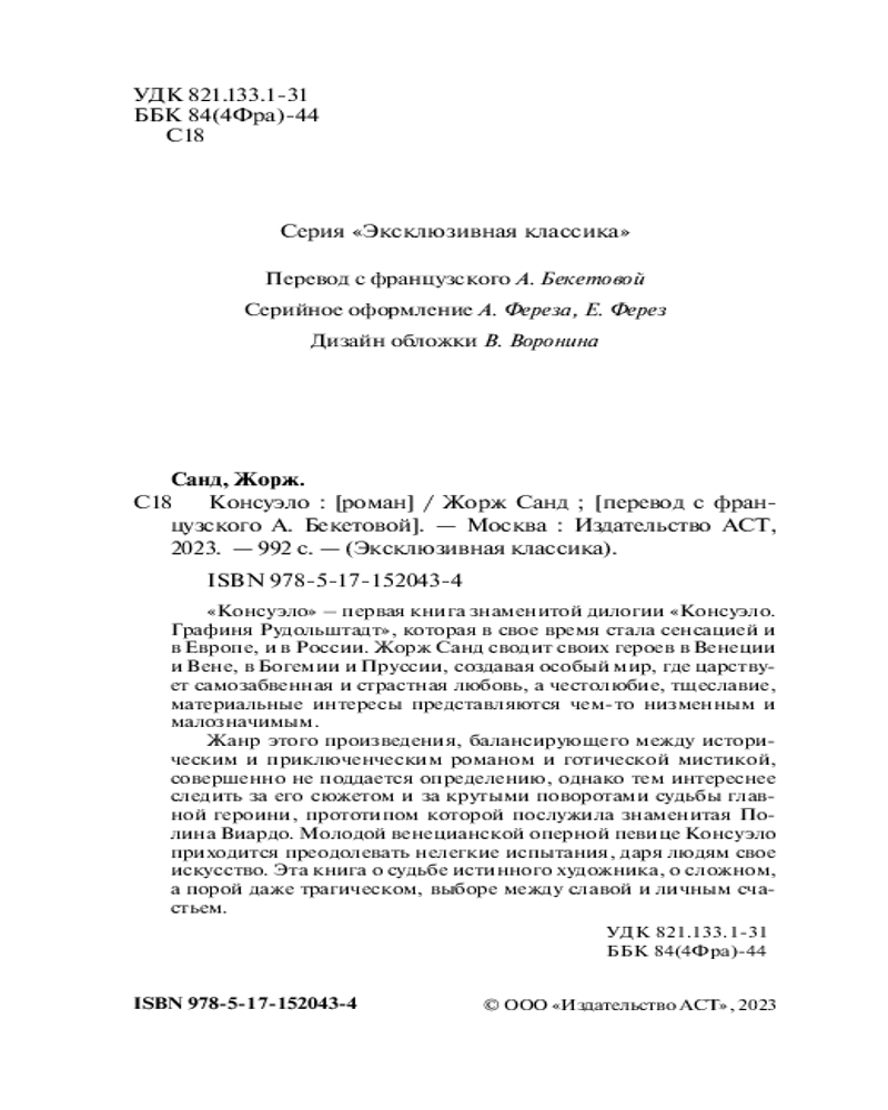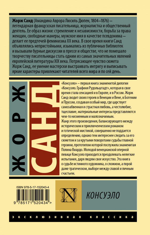 КонсуэлоВ данный момент этот товар отсутствует в продаже. Возможно, у нас найдется аналогичный или похожий товар здесь. Серия: Эксклюзивная классика «Консуэло» — первая книга знаменитой дилогии «Консуэло. Графиня Рудольштадт», которая в свое время стала сенсацией и в Европе, и в России. Жорж Санд сводит своих героев в Венеции и Вене, в Богемии и Пруссии, создавая особый мир, где царствует самозабвенная и страстная любовь, а честолюбие, тщеславие, материальные интересы представляются чем-то низменным и малозначимым. |