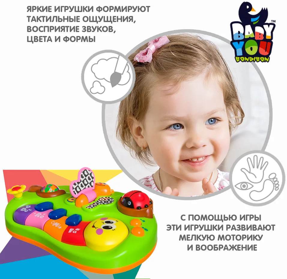 Bondibon Игрушка разивающая «Веселые насекомые»В данный момент этот товар отсутствует в продаже. Возможно, у нас найдется аналогичный или похожий товар здесь. Развивающее пианино «Веселые насекомые» — это замечательная игрушка от Bondibon! Пианино работает в двух режимах. Нажимайте, поворачивайте и крутите насекомых и слушайте музыку, песенки, стишки и сказки. Нажимайте на ноты слушайте мелодии или учите их, играйте сами. Обучение и развитие ребенка в игровой форме: способствует развитию мелкой моторики, звуковому и слуховому восприятию, развитию пространственного мышления. |