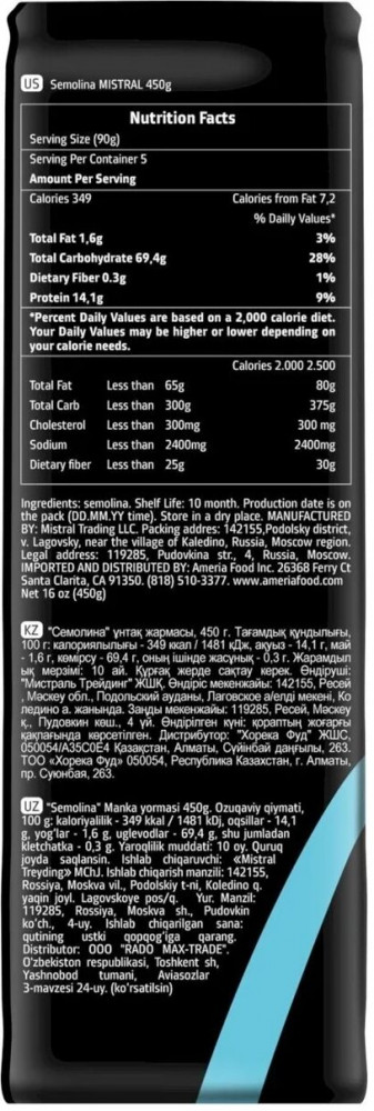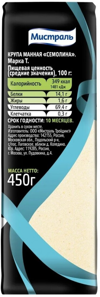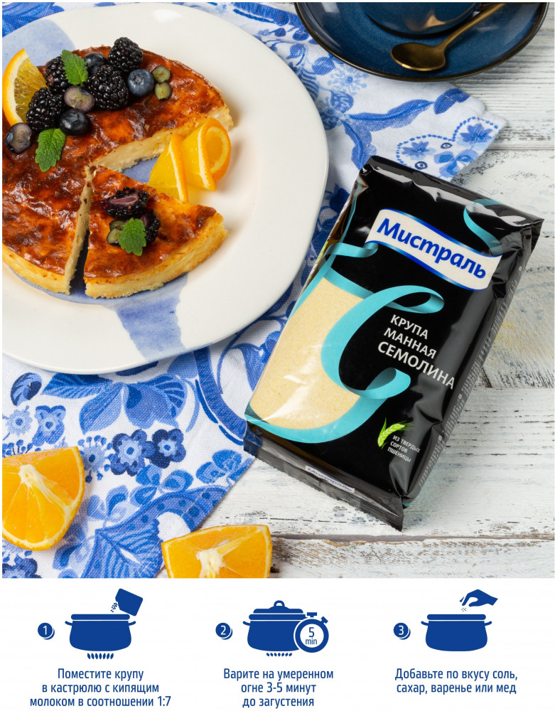 Мистраль Крупа манная «Семолина»вкусная крупная фракция твёрдые сорта чистая крупа хороший срок годности жёлтый цвет высокая цена В данный момент этот товар отсутствует в продаже. Возможно, у нас найдется аналогичный или похожий товар здесь. Крупа манная Минстраль «Семолина» станет быстрым и полезным вариантом для завтрака. Продукт изготовлен из твердых сортов пшеницы и имеет высокое содержание витаминов Омега-3, Омега-6, B1, B2, B3, кальция, магния, фосфора, цинка и многих других элементов, благотворно влияющих на работу всех систем организма. Каша имеет пониженное содержание жира и быстро насыщает необходимой энергией, поэтому ее часто используют в рационе люди, ведущие здоровый образ жизни. Также это один из основных компонентов детского питания. Продукт можно разнообразить добавлением сливочного масла, сиропов, меда или фруктов. Изделие также используется в качестве дополнения к рыбным и мясным блюдам. |
