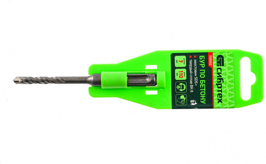 Бур по бетону Сибртех размером 7 × 110 мм предназначен для перфораторов с хвостовиком типа SDS Plus. Способен сверлить отверстия в материалах из бетона и кирпича, а также в искусственном и природном камне. Бур отлично подойдет для домашнего использования со средним объемом работ.