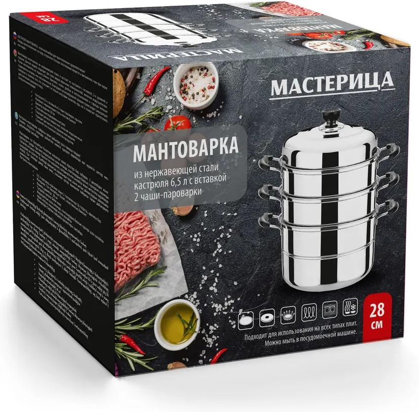 | Ассортимент компании «Пилот МС» пополнился мантоварками торговой марки «Мастерица». В продаже представлены изделия диаметром 26, 26 и 30см. Мантоварки выполнены из нержавеющей стали AISI 410, ручки — бакелитовые. Мантоварки можно использовать на всех типах варочных поверхностей, включая индукционные. |