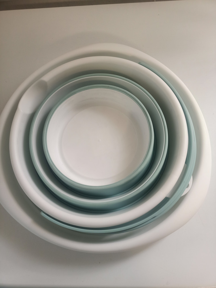 Тазик прочный. Складывается до размера в высоту 5см. Удобный размер в хозяйстве или на кухне.