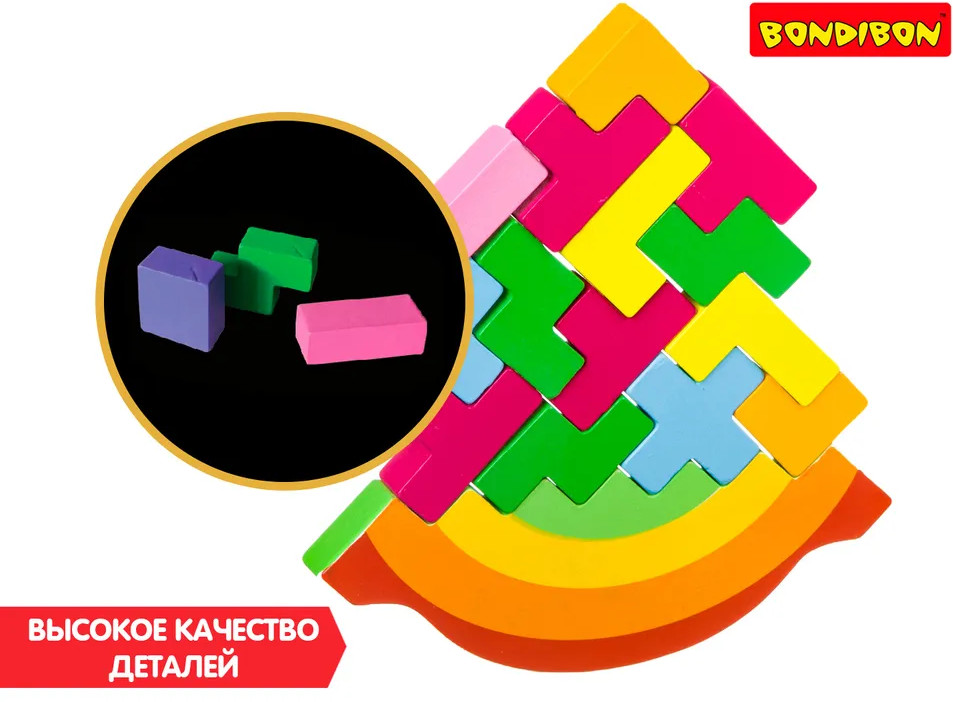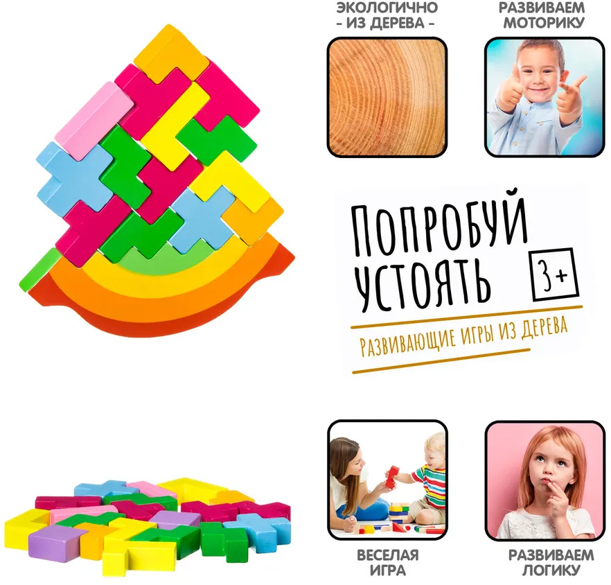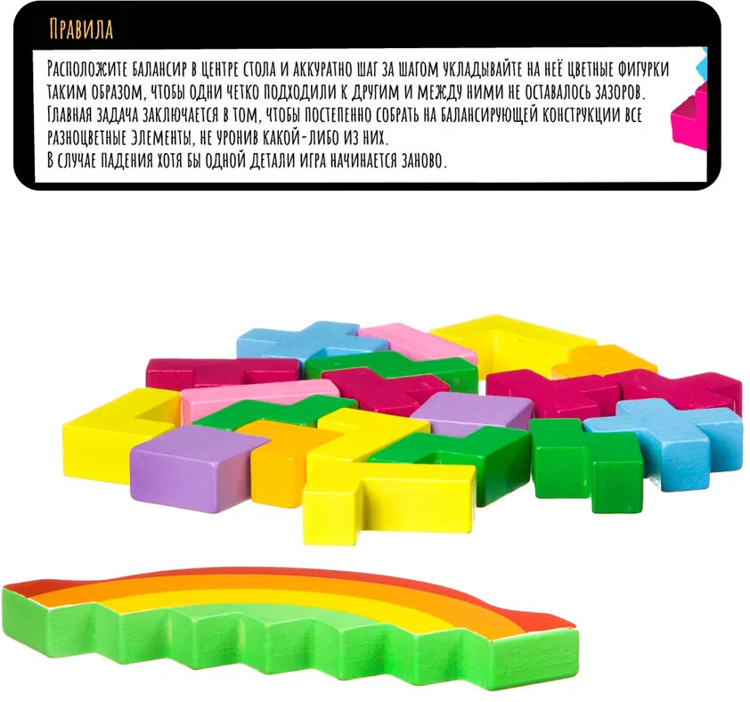Все составляющие элементы настольной игры выполнены из экологически чистого материала – дерева, обработанного безопасными красками. Расположите балансир в центре стола и аккуратно, шаг за шагом, укладывайте на нее цветные фигурки таким образом, чтобы одни четко подходили к другим и между ними не оставалось зазоров. Главная задача заключается в том, чтобы постепенно собрать на балансирующей конструкции все разноцветные элементы, не уронив какой-либо из них. В случае падения хотя бы одной детали игра начинается заново.