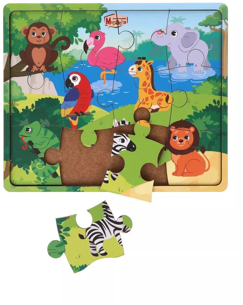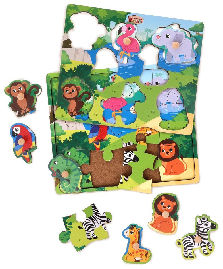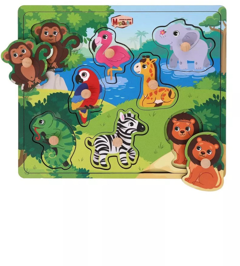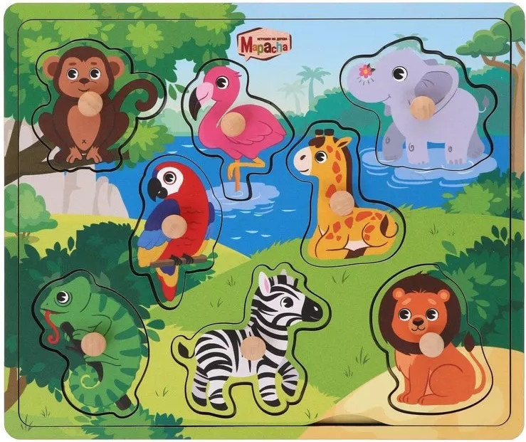 В игровом мире «Mapacha Джунгли» совсем не опасные, а очень даже приветливые и веселые! Яркие вкладыши 2 в 1 познакомят малыша с симпатичными обитателями дикой природы, помогут ему развить мелкую моторику, воображение и логику, а также запомнить цвета в увлекательной игровой форме. Все детали изготовлены из качественного древесного материала, тщательны обработаны и безопасны для игр.