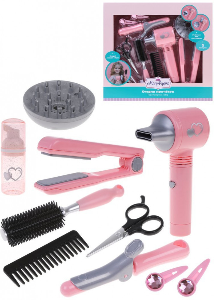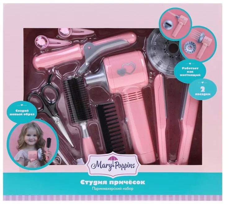С игровым набором парикмахерских принадлежностей «Mary Poppins» любая девочка сможет почувствовать себя в роли талантливого парикмахера-стилиста. Фен работает словно настоящий. В комплекте к фену прилагаются две сменные насадки. Процесс создания новых причесок и стильных образов — это так интересно! Можно будет открыть игрушечный салон красоты прямо у себя дома, а затем пригласить на «стрижку» и «укладку» всех любимых кукол и подруг.