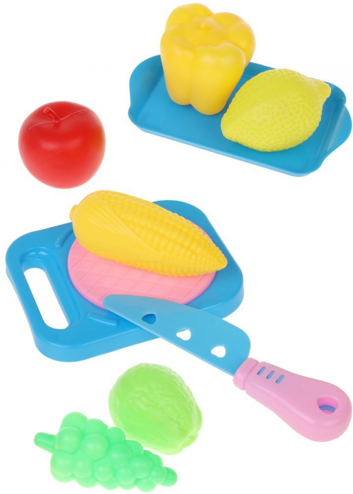В наборе: муляж овощей и фруктов (кукуруза, виноград, лимон, перец, томат, капуста), поднос, тарелочка, разделочная доска и кухонный ножик. Всего 10 элементов длиной 4-11 см.