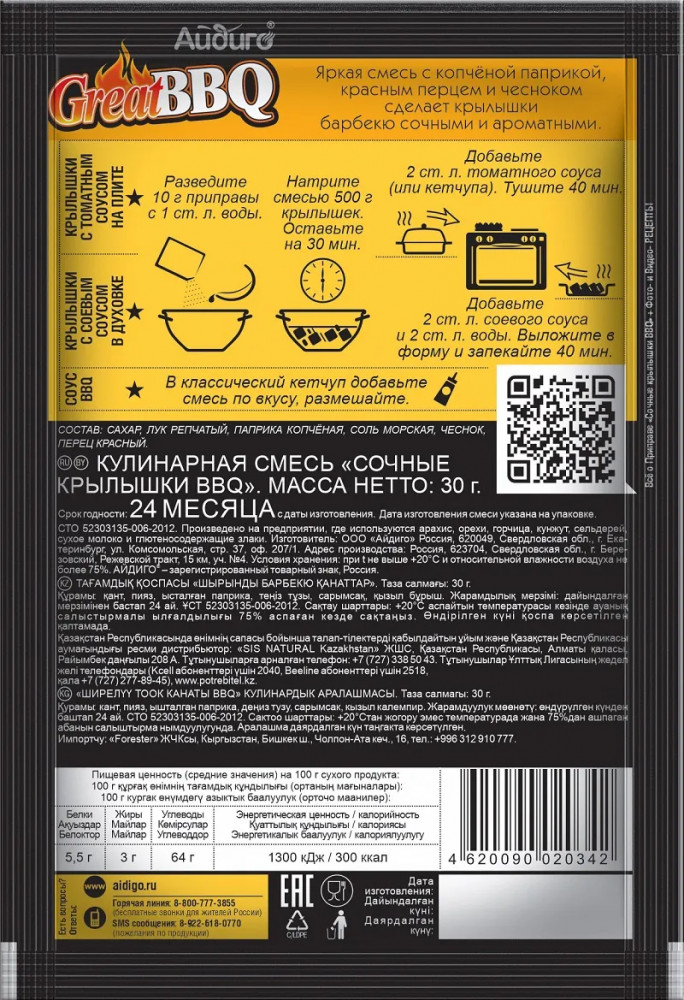 💳 Оплатить за товар можно при получении 🇰🇿 Есть бесплатная доставка по Казахстану от 1 дня 🎁 Копите бонусы с каждой покупки Приправа для сочных крылышек Great BBQ. Яркая смесь с копченой паприкой, красным перцем, чесноком и луком сделает крылышки барбекю сочными и ароматными. С приправой можно приготовить крылышки в томатном соусе на плите, с соевым соусом в духовке. А также на открытом огне. Приятный бонус — рецепт соуса на упаковке. |