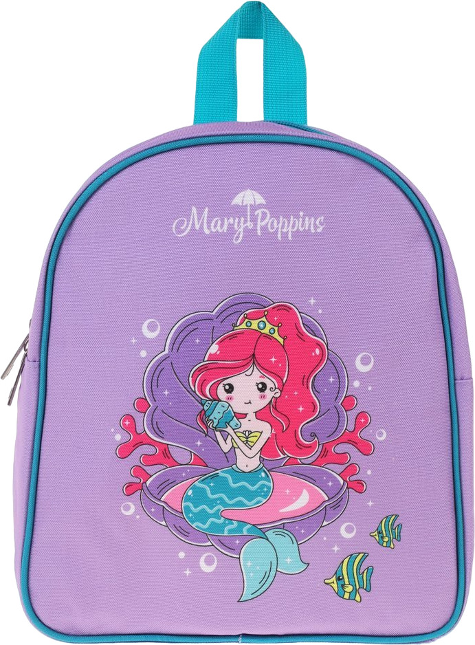 Рюкзак выполнен в симпатичной расцветке. На лицевой стороне имеется изображение красавицы-русалочки и фирменная эмблема бренда «Mary Poppins». В рюкзачке предусмотрено одно отделение, закрывающееся на молнию. Рюкзак снабжен текстильной петелькой и двумя мягкими широкими лямками, которые можно регулировать по длине.