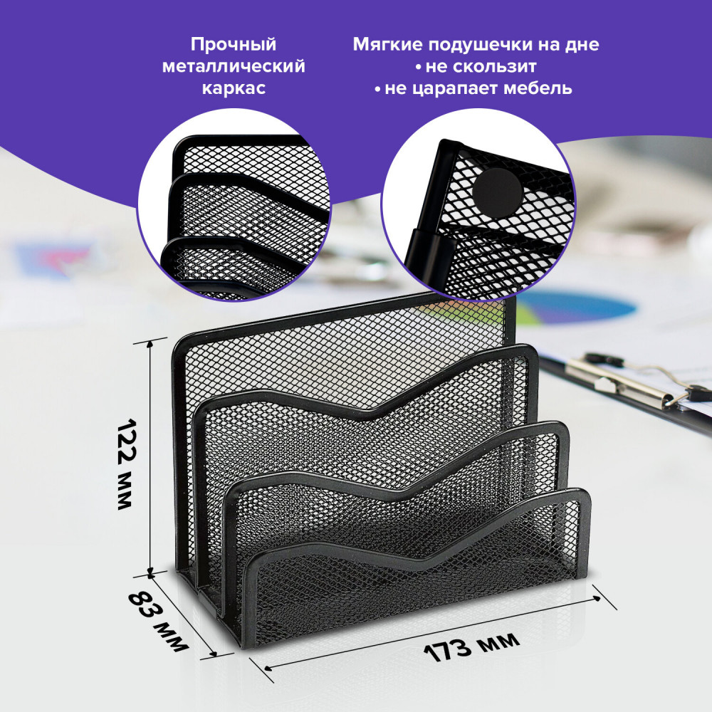 💳 Оплатить за товар можно при получении 🇰🇿 Есть бесплатная доставка по Казахстану от 1 дня 🎁 Копите бонусы с каждой покупки Серия: Germanium Подставка для бумаг и писем BRAUBERG «Germanium» предназначена для хранения журналов, книг и бумаг любого формата с возможностью тематической сортировки. Изготовлена из металлической сетки черного цвета. Имеет три секции и четыре отделения. |