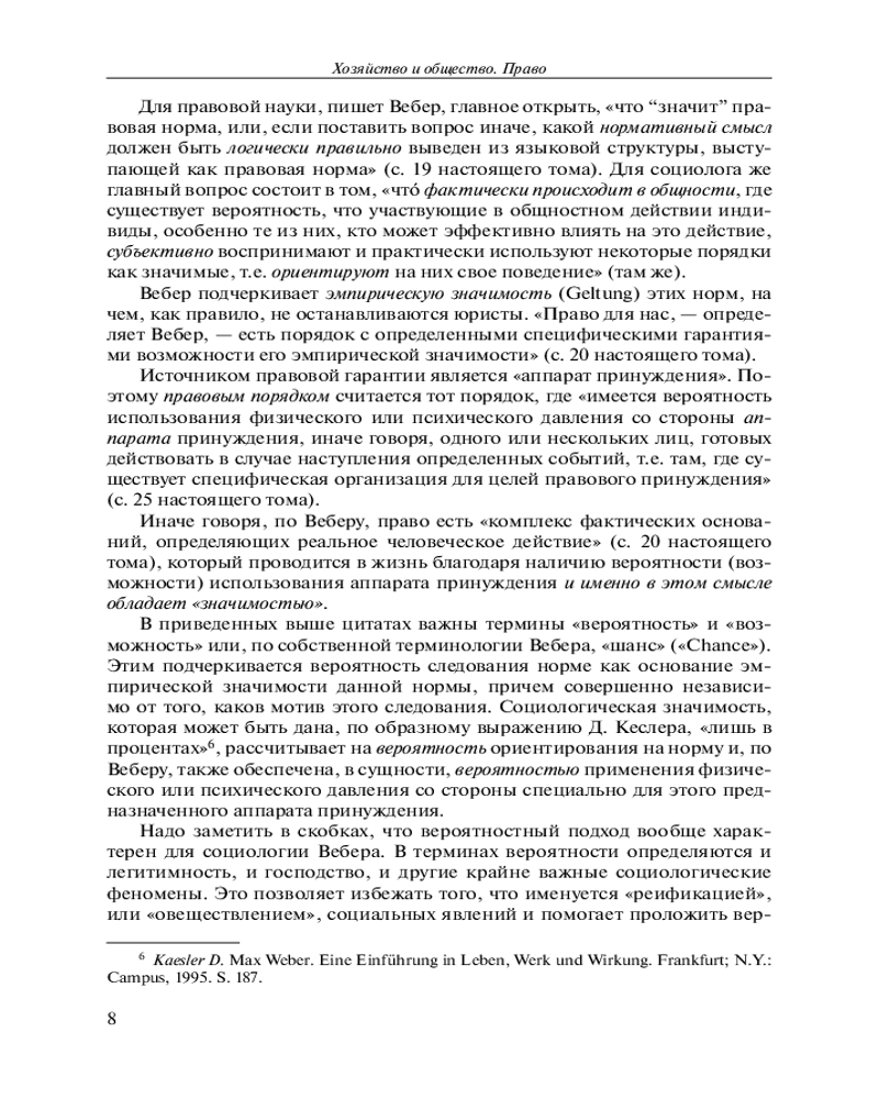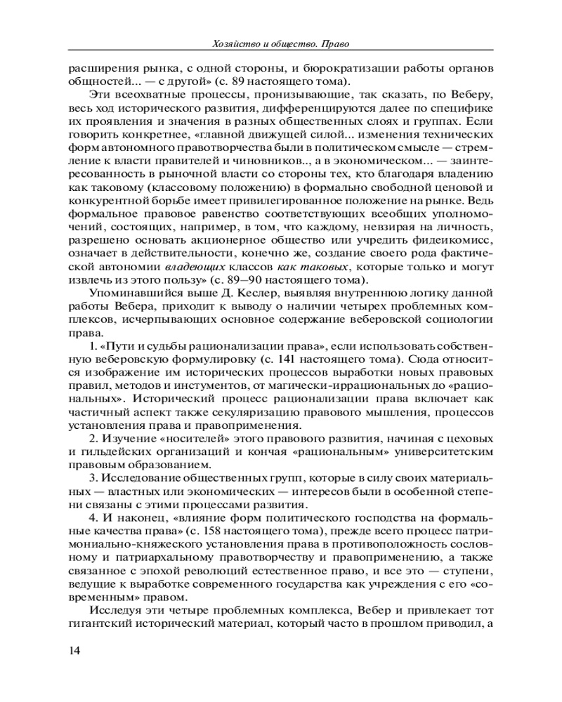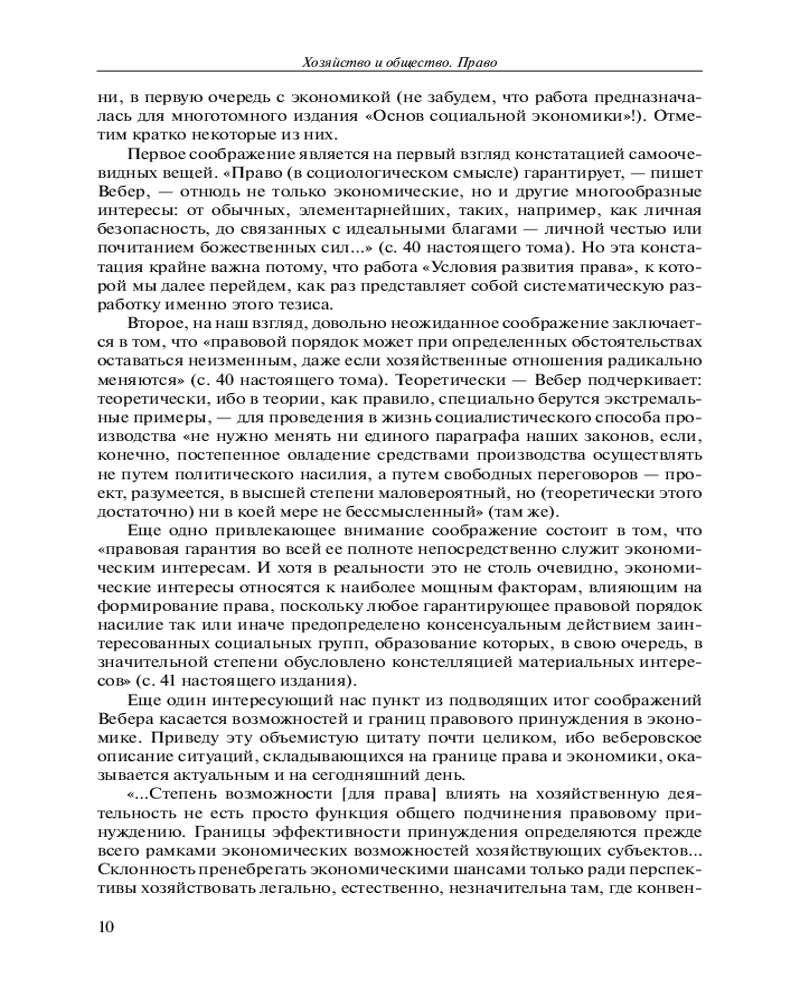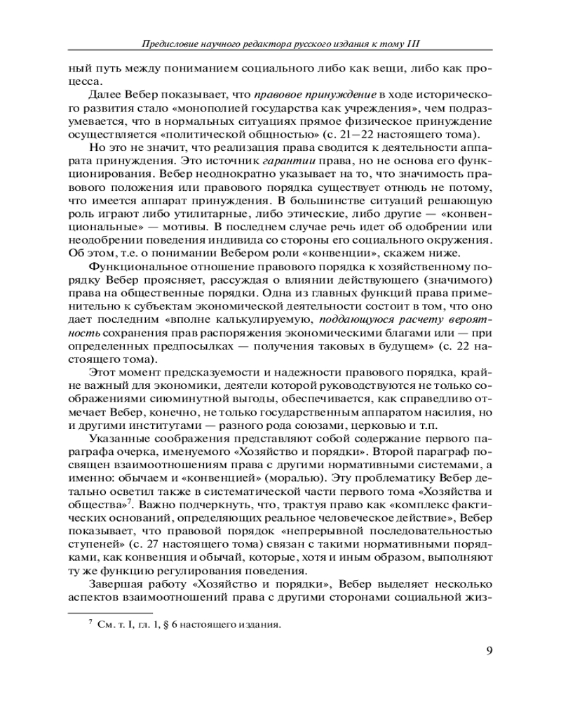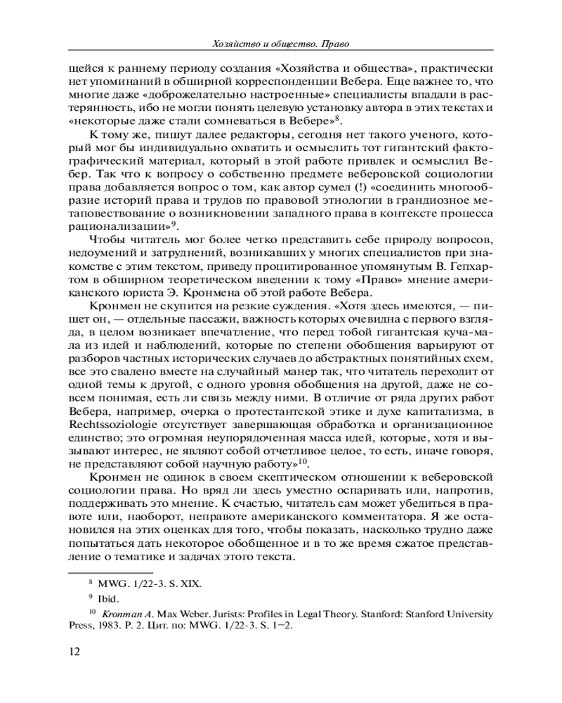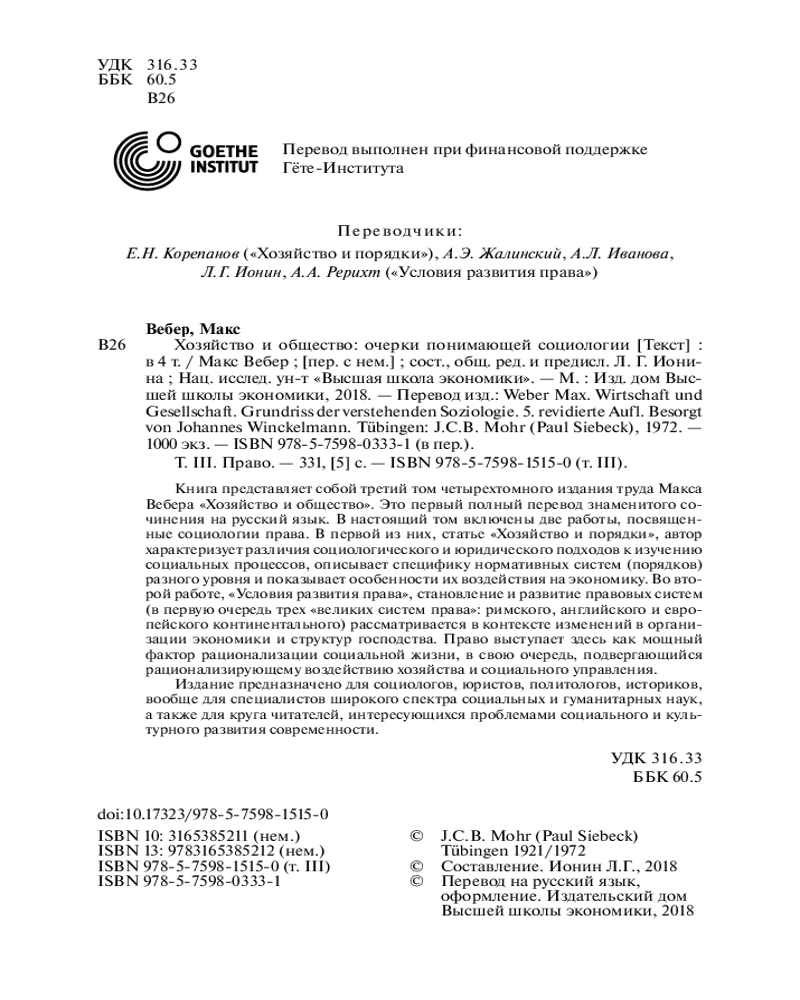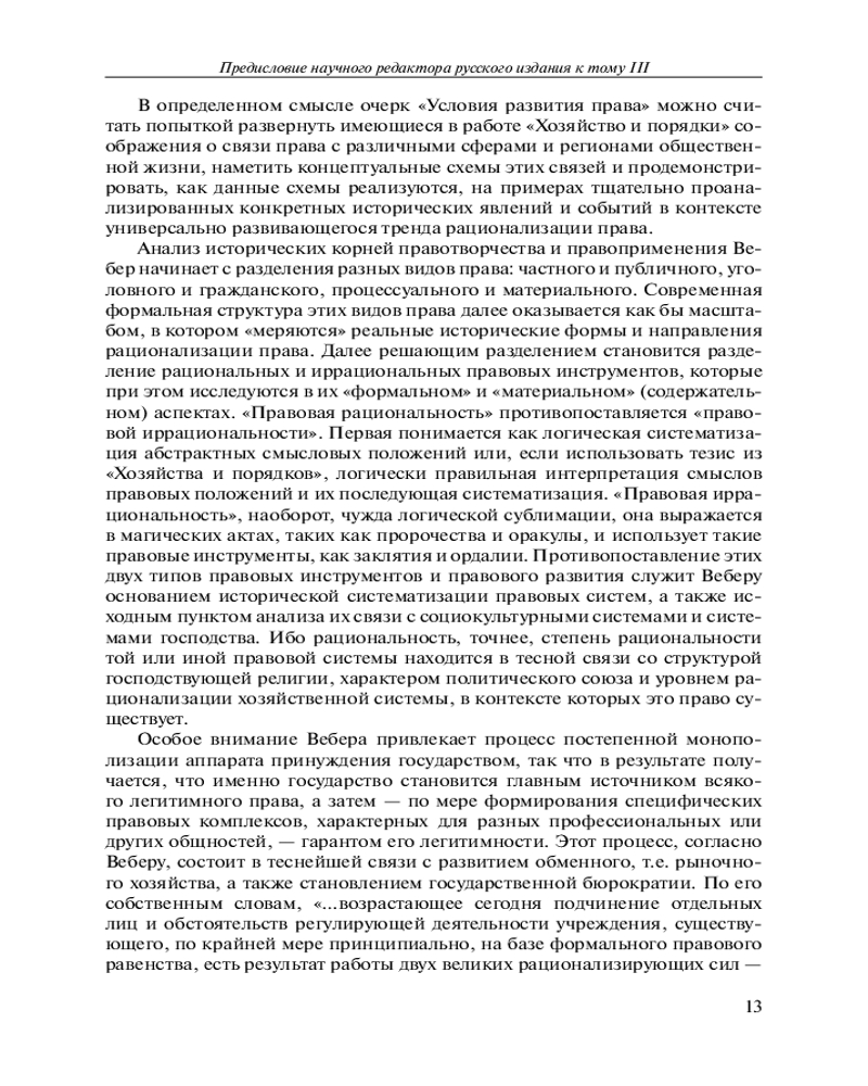 Хозяйство и общество. Очерки понимающей социологии. ПравоВ данный момент этот товар отсутствует в продаже. Возможно, у нас найдется аналогичный или похожий товар здесь. Книга представляет собой третий том четырехтомного издания труда Макса Вебера «Хозяйство и общество». Это первый полный перевод знаменитого сочинения на русский язык. В настоящий том включены две работы, посвященные социологии права. В первой из них, статье «Хозяйство и порядки», автор характеризует различия социологического и юридического подходов к изучению социальных процессов, описывает специфику нормативных систем (порядков) разного уровня и показывает особенности их воздействия на экономику. Во второй работе, «Условия развития права», становление и развитие правовых систем (в первую очередь трех «великих систем права»: римского, английского и европейского континентального) рассматривается в контексте изменений в организации экономики и структур господства. Право выступает здесь как мощный фактор рационализации социальной жизни, в свою очередь, подвергающийся рационализирующему воздействию хозяйства и социального управления. Издание предназначено для социологов, юристов, политологов, историков, вообще для специалистов широкого спектра социальных и гуманитарных наук, а также для круга читателей, интересующихся проблемами социального и культурного развития современности. |