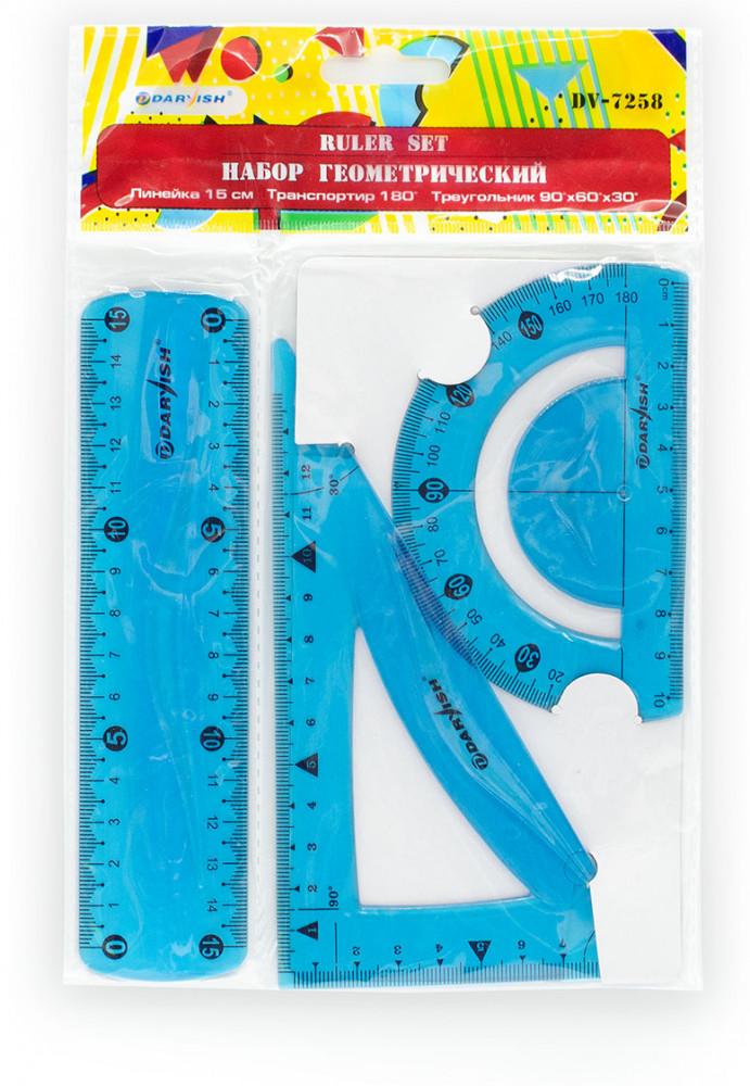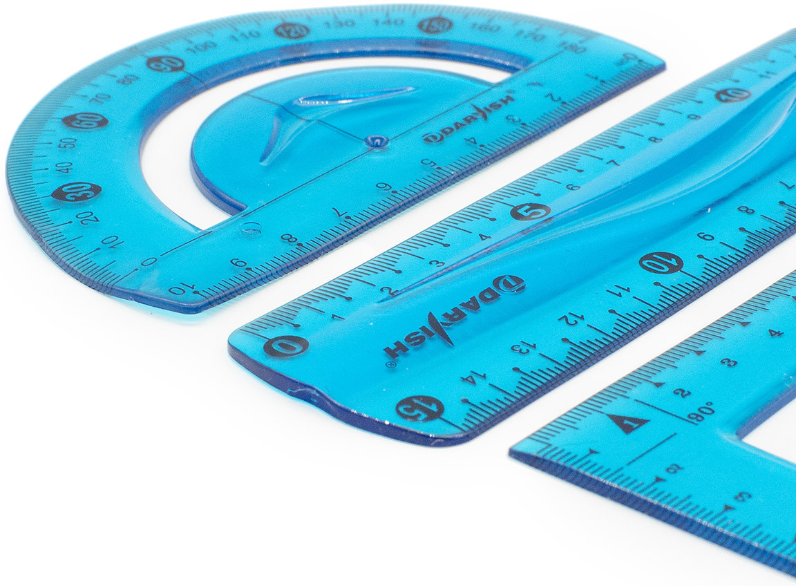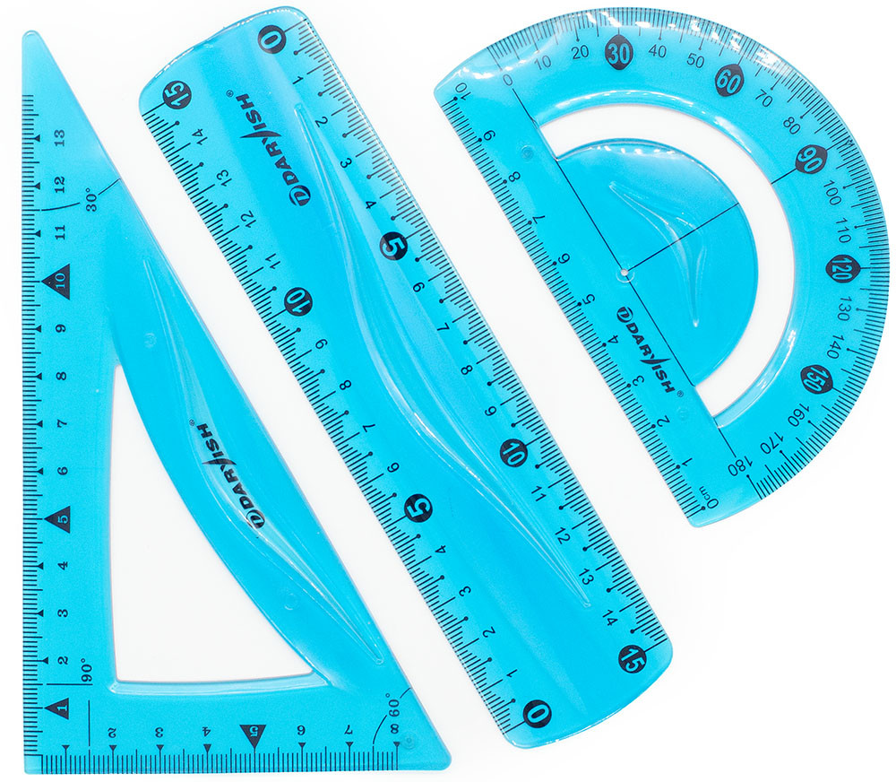 Геометрический набор пригодится школьникам, студентам, сотрудникам офисов, всем, кто работает с чертежами и бумажной документацией. Предметы изготовлены из мягкого пластика, помещаются даже в небольшой сумке.