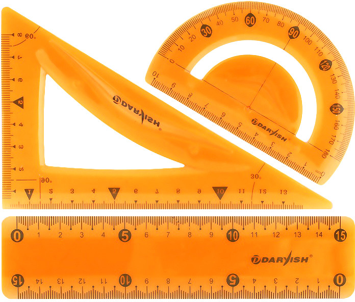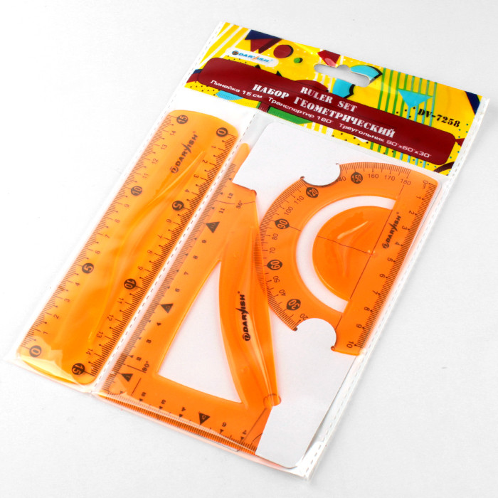 Геометрический набор пригодится школьникам, студентам, сотрудникам офисов, всем, кто работает с чертежами и бумажной документацией. Предметы изготовлены из мягкого пластика, помещаются даже в небольшой сумке.