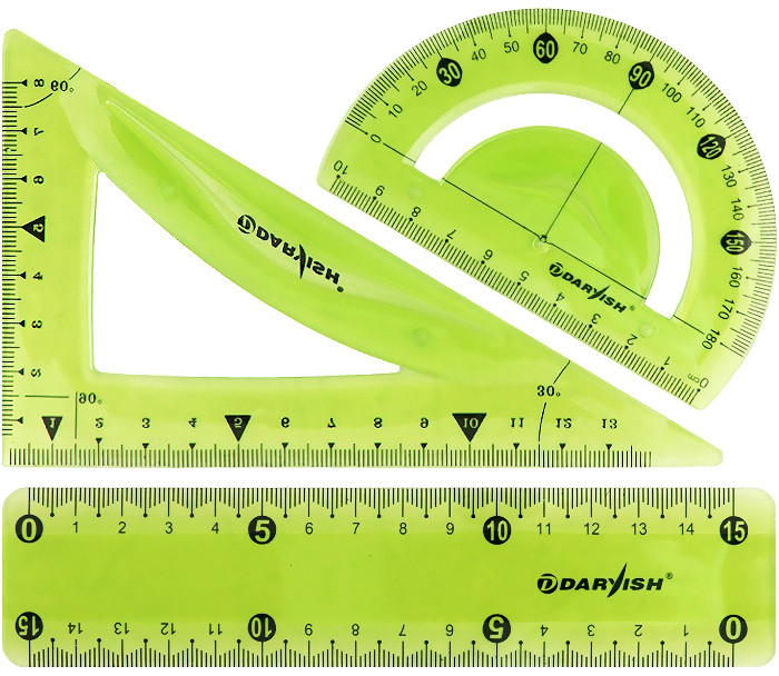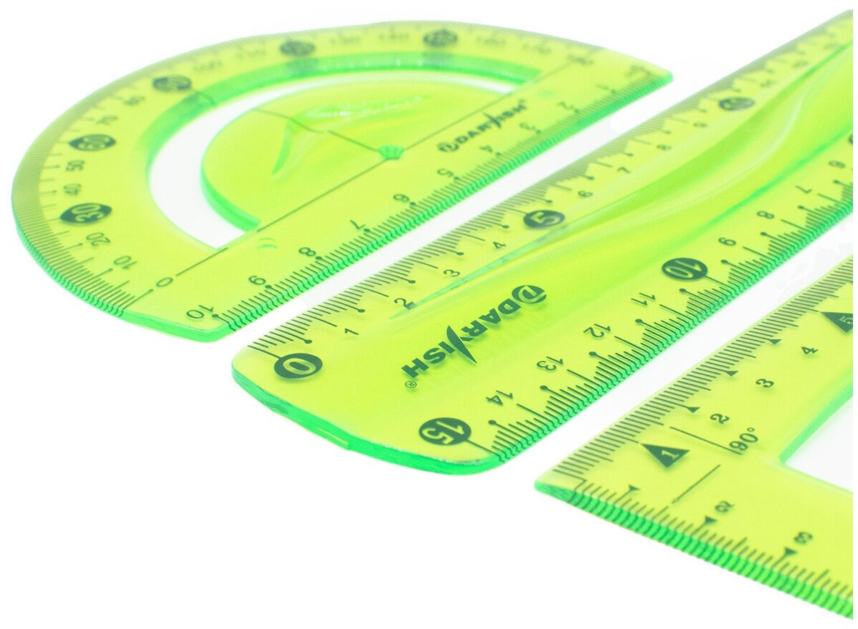 Геометрический набор пригодится школьникам, студентам, сотрудникам офисов, всем, кто работает с чертежами и бумажной документацией. Предметы изготовлены из мягкого пластика, помещаются даже в небольшой сумке.