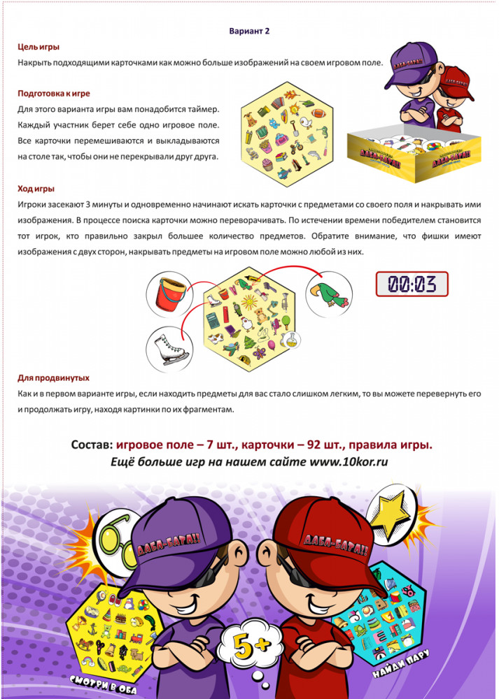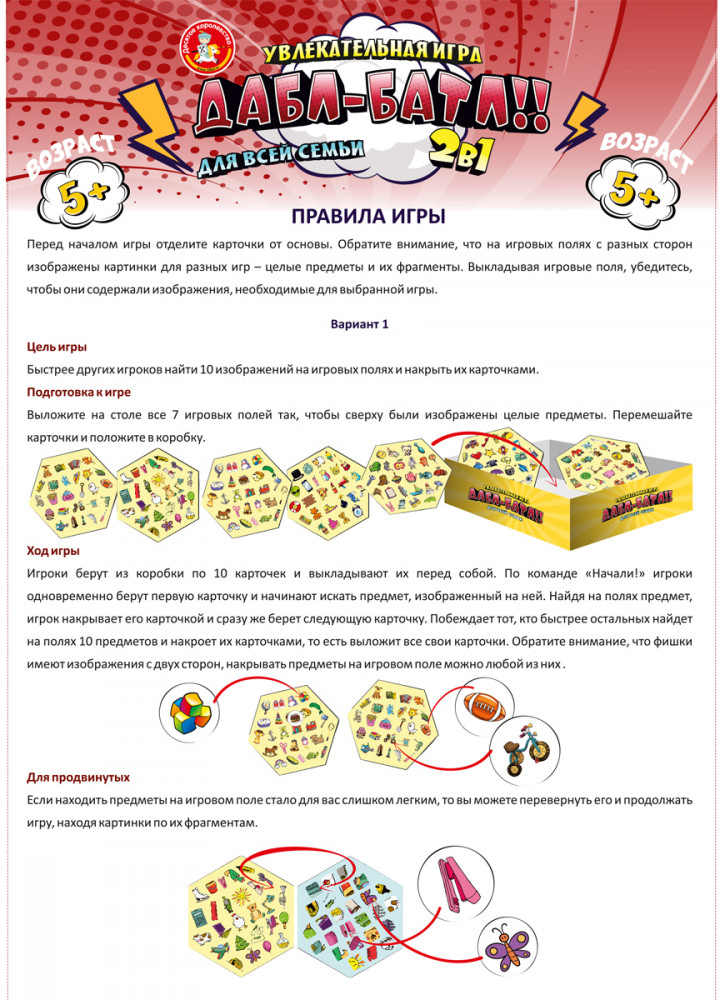 💳 Оплатить за товар можно при получении 🇰🇿 Есть бесплатная доставка по Казахстану 🎁 Копите бонусы с каждой покупки Настольная игра для детей «Дабл-Батл» — это сразу два варианта игры на смекалку, внимательность и быстроту реакции. Игра предназначена для детей старше 5 лет . |