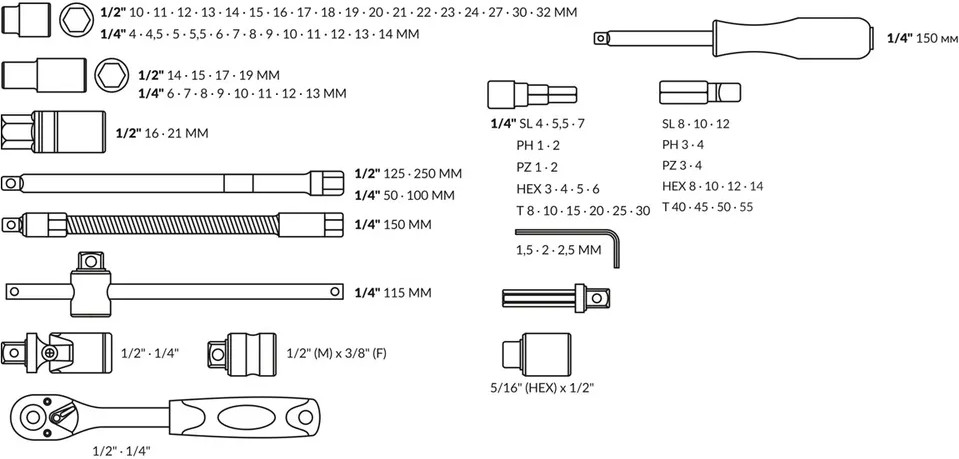 • головка торцевая 1/4″: 4, 4.5, 5, 5.5, 6, 7, 8, 9, 10, 11, 12, 13, 14 мм
