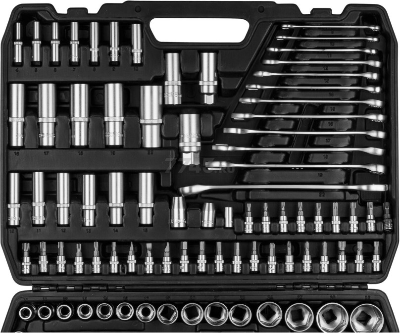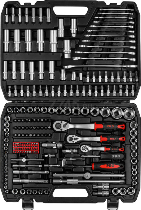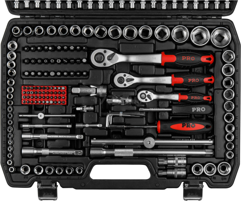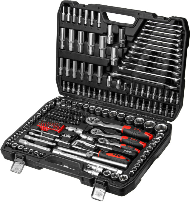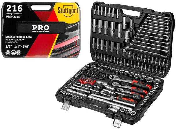 Набор инструментов 1/4″, 1/2″, 3/8″ 6 граней 216 предметов PRO STARTUL Stuttgart (PRO-216S) предназначен для ремонта и обслуживания автомобиля. Набор инструментов широко применяется как для личных, так и для коммерческих целей: в гараже у автолюбителя, на небольшом СТО или крупнейших автосервисах и даже на производстве. Рабочие части изготовлены из хромованадиевой стали, устойчивы к коррозии. Финишная обработка головок: сатинирование. Кейс выполнен из прочного противоударного пластика с металлическими замками.