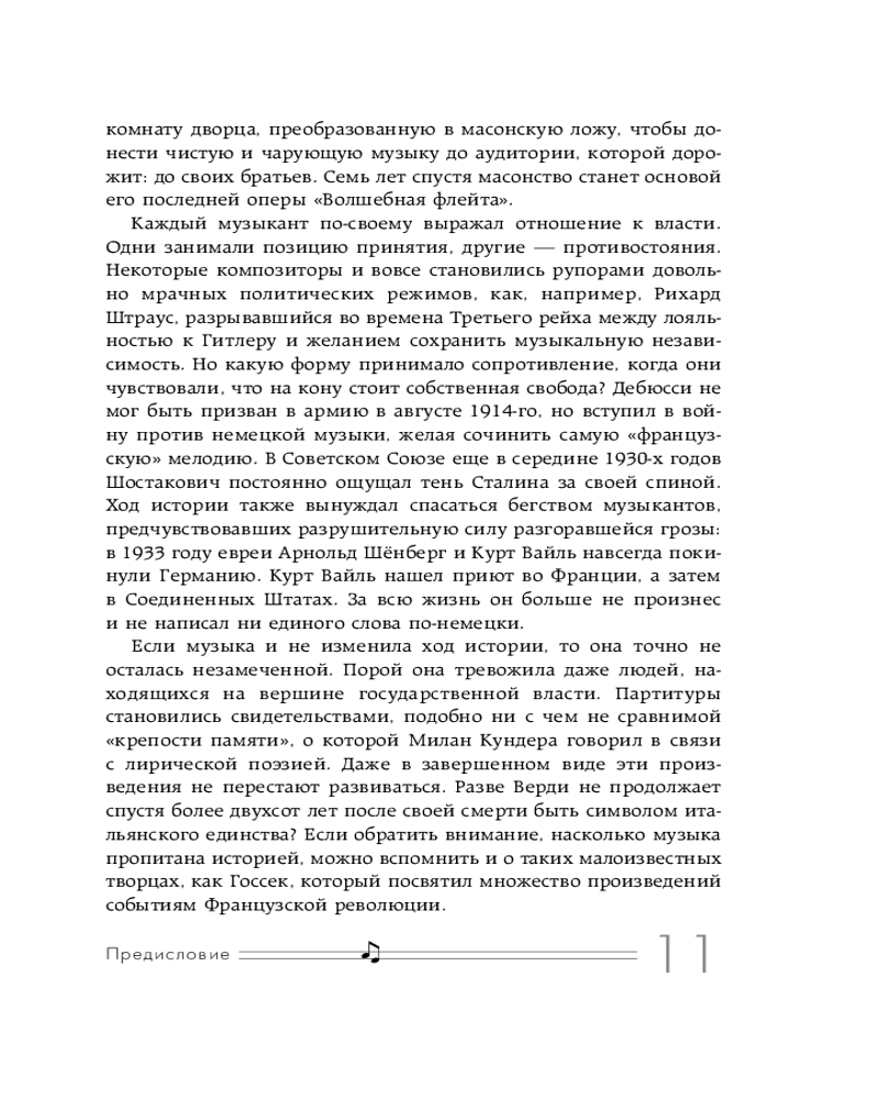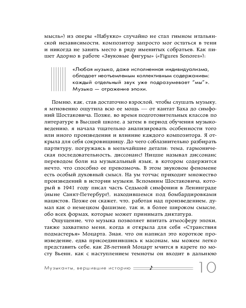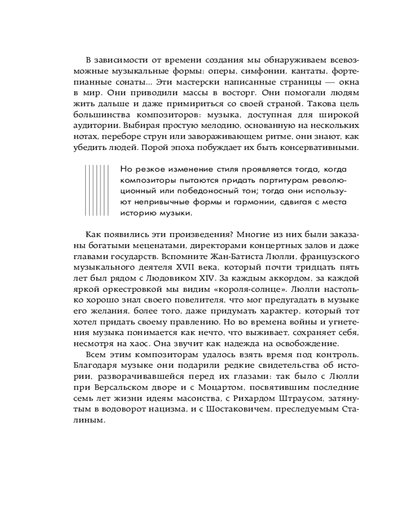 Ноту за нотой вы ощутите то, что ощущали они. Благодаря этой книге вы не только лучше поймете контекст создания знаменитых шедевров, но и сможете понять, что музыка без слов бывает подчас громче любых речей с трибуны.