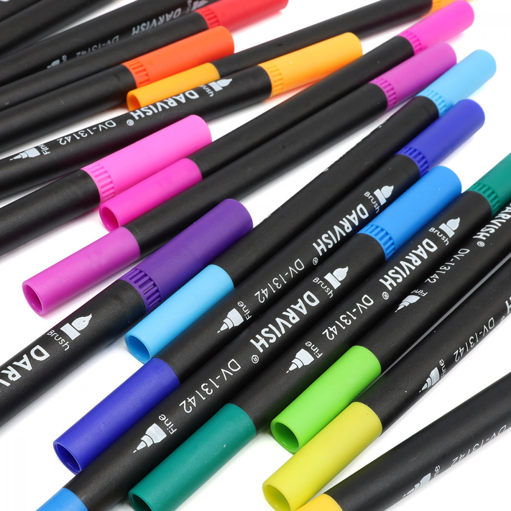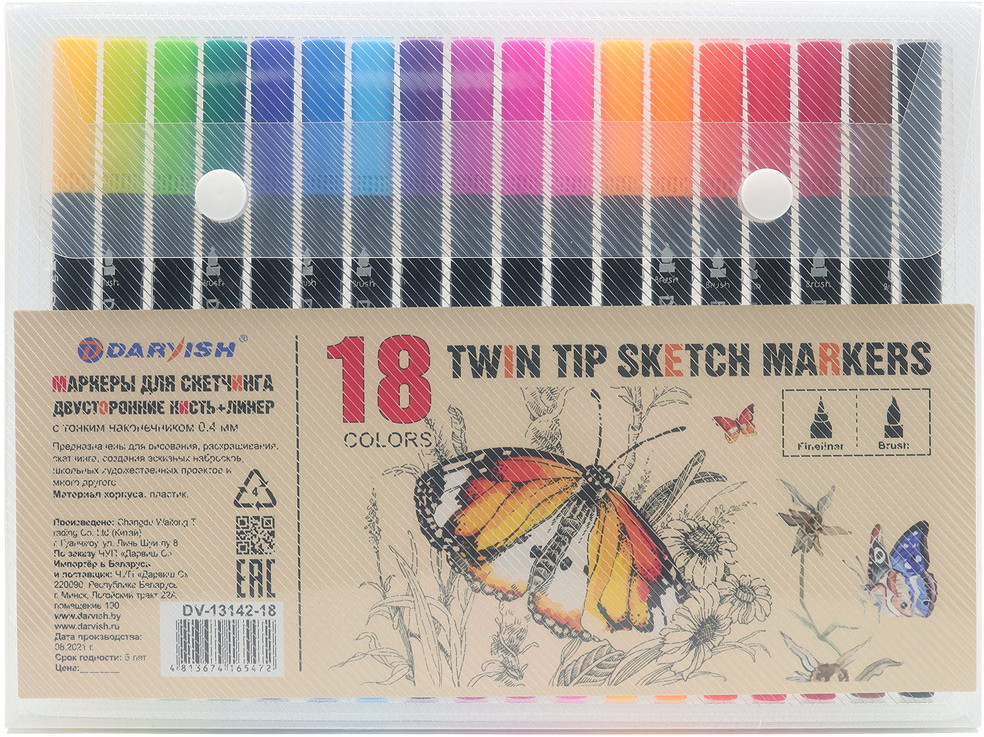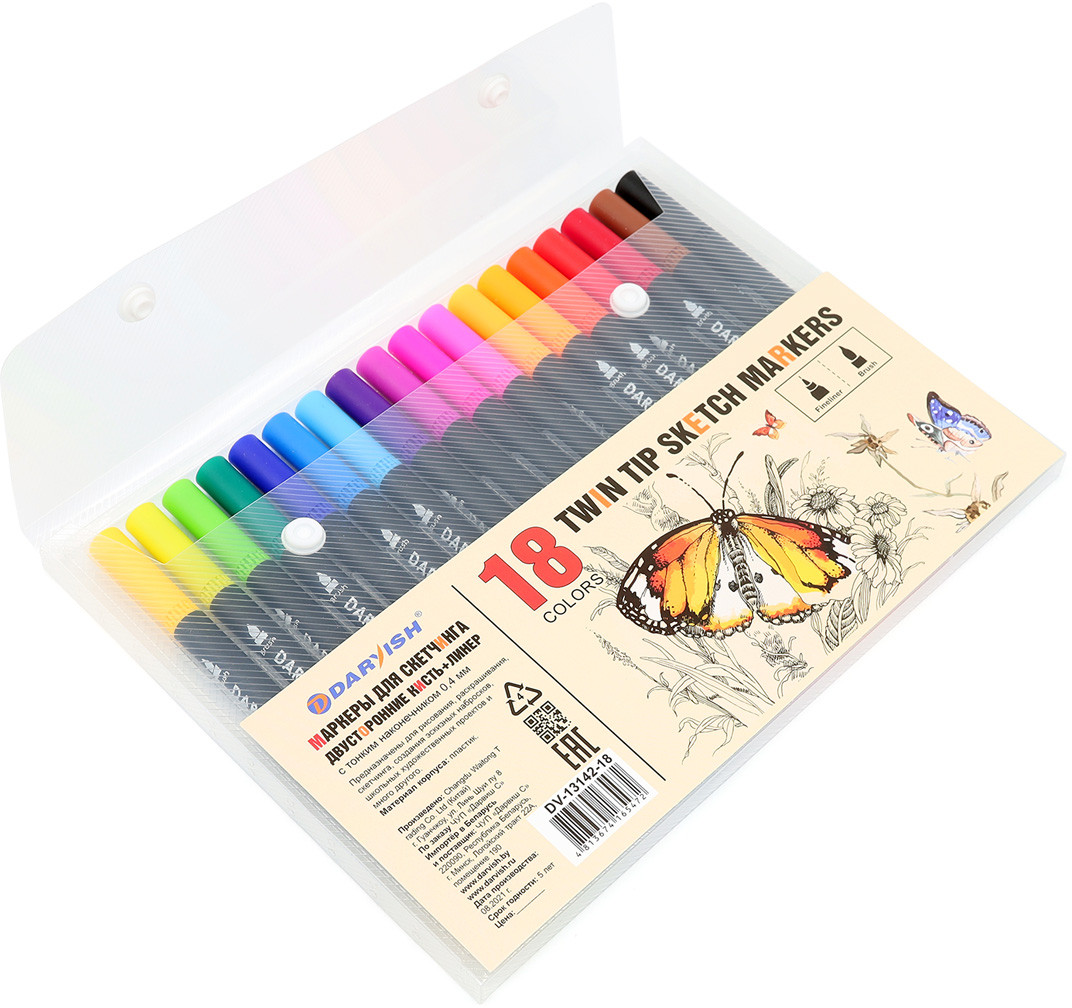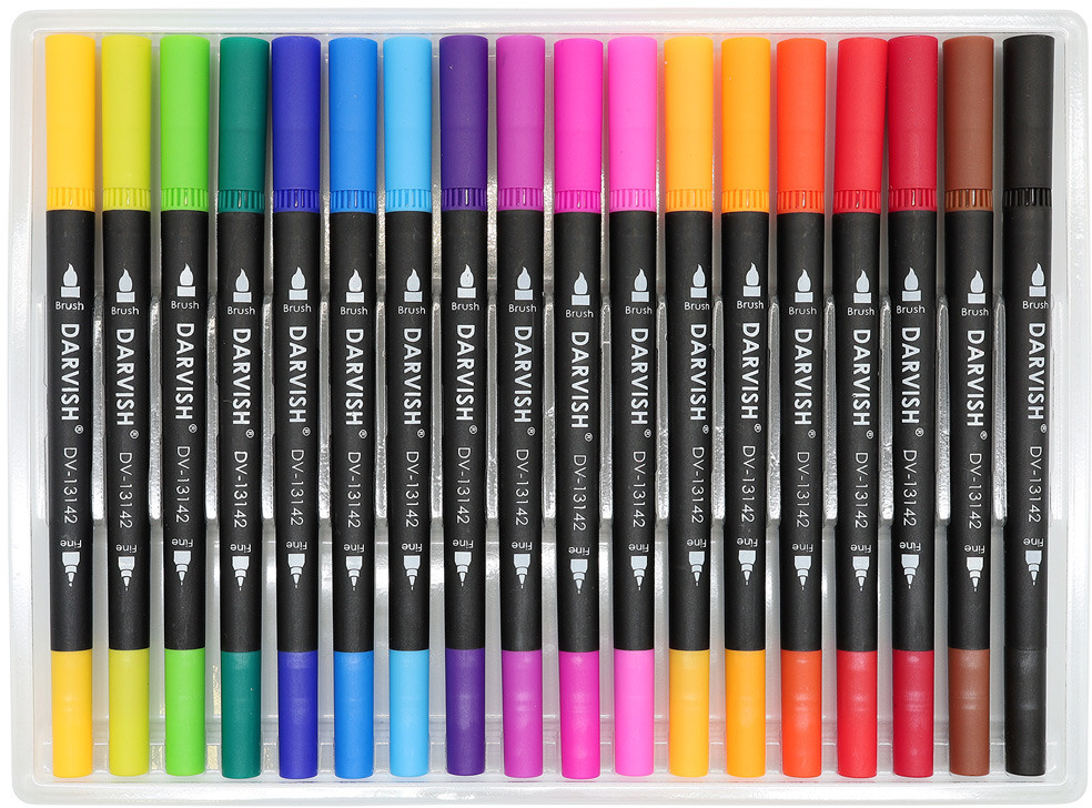Darvish Набор маркеров двусторонних для скетчингаВ данный момент этот товар отсутствует в продаже. Возможно, у нас найдется аналогичный или похожий товар здесь. Маркеры двусторонние: тонкий лайнер (0,4 мм) подходит для создания контуров и проработки деталей, а кисть с острым концом удобна для штриховки и заполнения цветом. Чернила имеют яркие и насыщенные цвета. Чтобы защитить стержень от высыхания, всегда плотно закрывайте колпачок. |