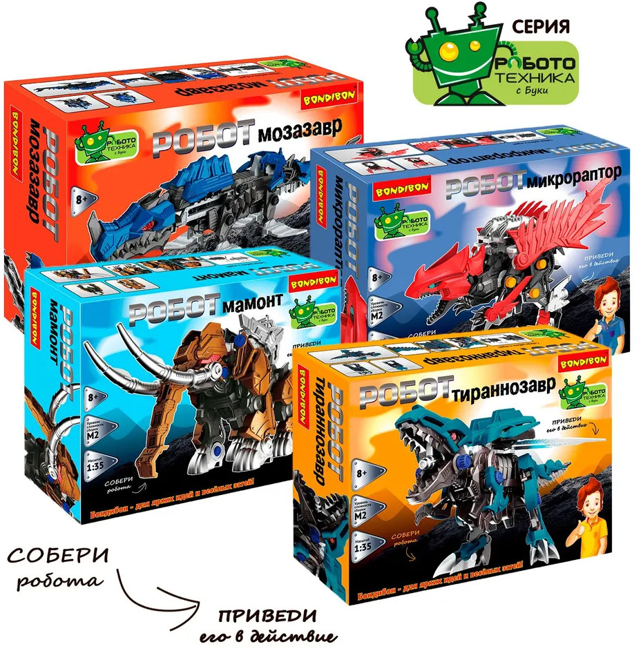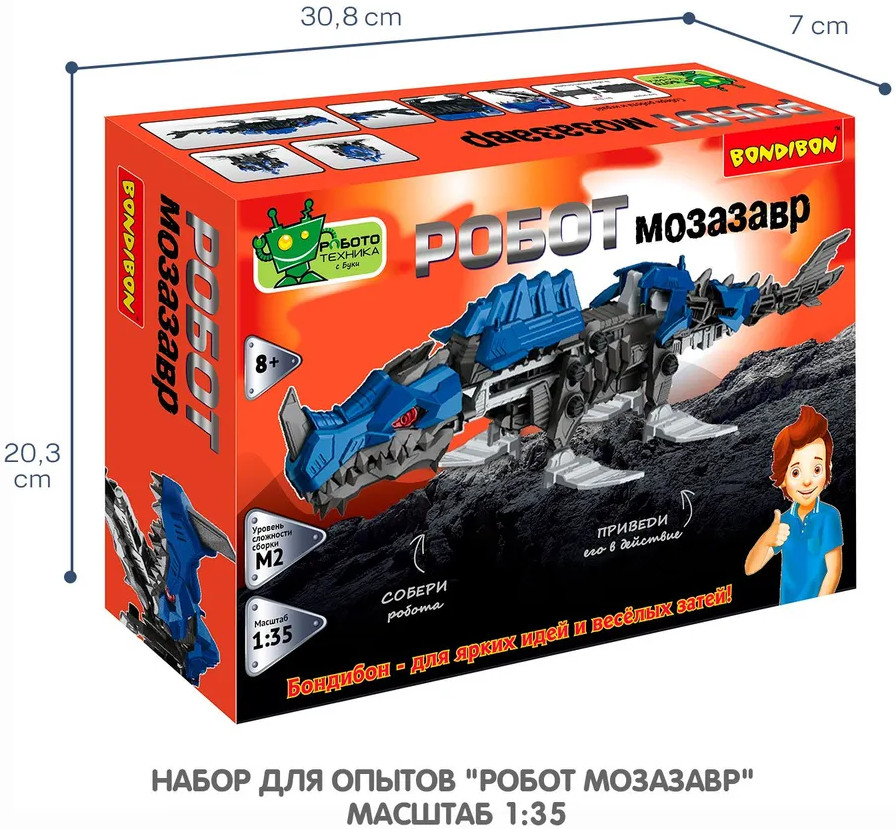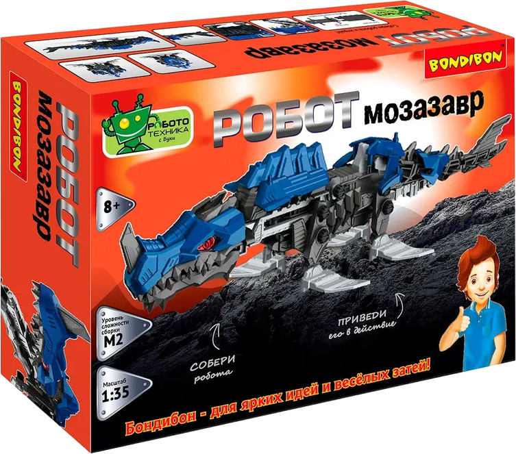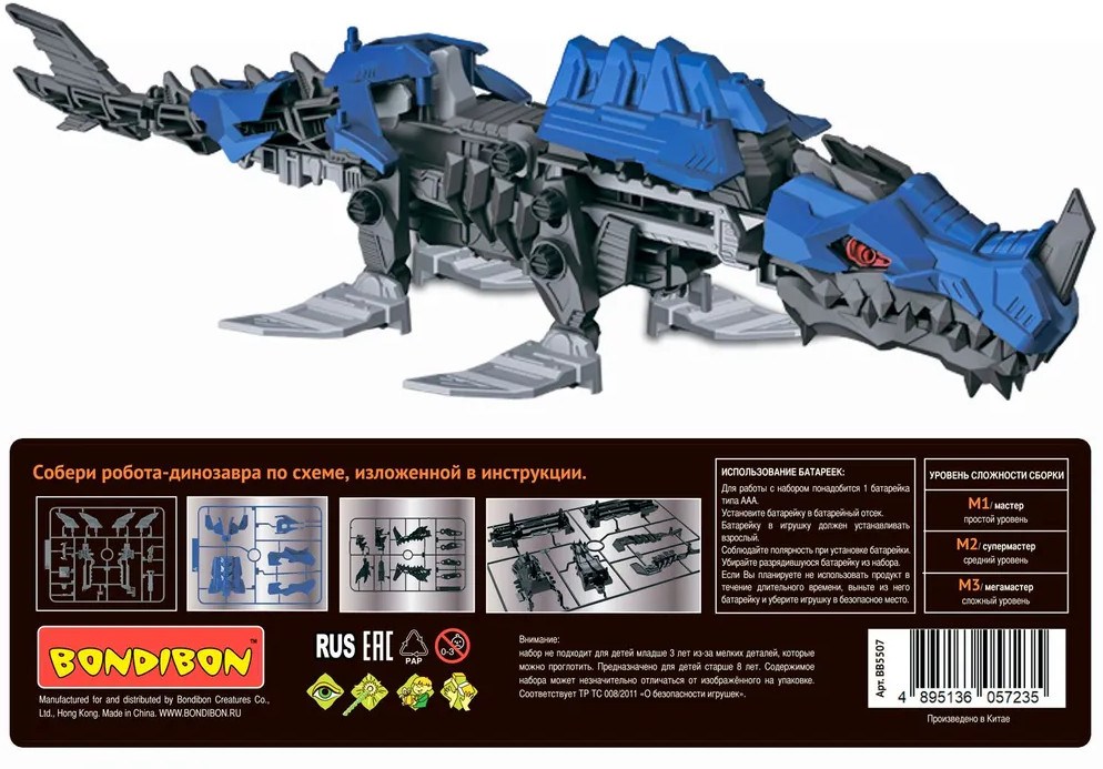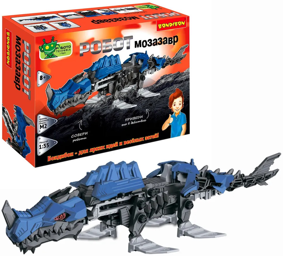 Мощные дино-монстры вернулись в наше время! Хотите побывать в Парке Юрского периода? Соберите могучего робота Мозазавра от Bondibon со множеством функций. Динозавр ходит, голова поворачивается, хвост виляет из стороны в сторону. Широко открывает пасть.
