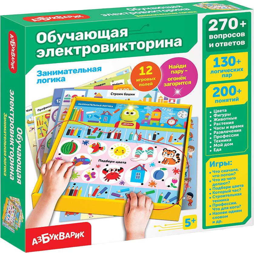 В данный момент этот товар отсутствует в продаже. Возможно, у нас найдется аналогичный или похожий товар здесь. Серия: Обучающая электровикторина Обучающая электровикторина «Занимательная логика» — увлекательная интерактивная игра, с которой ребенок получит новые знания об окружающем мире. Суть этой игры — в исследовательском подходе: ребенок будет сам подбирать логические пары на каждой карточке, соединяя их проводками электронного модуля.