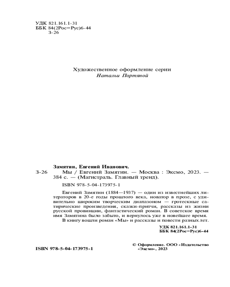 МыВ данный момент этот товар отсутствует в продаже. Возможно, у нас найдется аналогичный или похожий товар здесь. Серия: Магистраль. Главный тренд «Мы» — это мир XXXII века, где имена заменены на буквы и цифры, люди едят продукты переработки нефти, государство контролирует всё, включая интимную жизнь граждан, а наличие у человека души — повод для визита к психотерапевту. Фантастика, скажете вы, — можно придумать всё что угодно. Да, но за это «что угодно», написанное Евгением Замятиным в 1920 году, автору устроили травлю, а роман в СССР был опубликован лишь 68 лет спустя. Фантастика оказалась колющей глаза, что, как мы знаем, обычно делает правда. Это было в двадцатом столетии, а сегодня до представленного Замятиным тридцать второго века осталось на сто лет меньше. Загляните в него сейчас! |