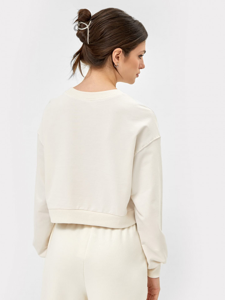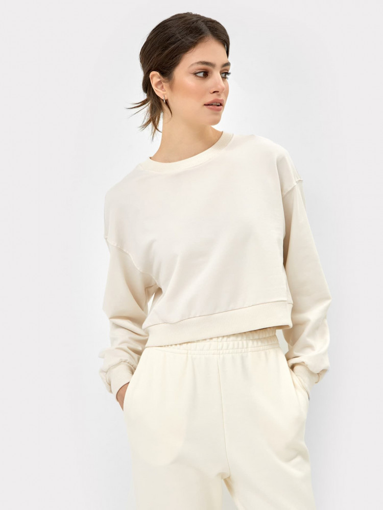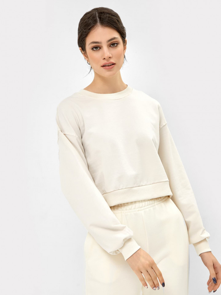 Свободный женский джемпер, выполненный из трикотажного футера. Вырез классический — круглый, не глубокий. Линия плеча спущена, в проймы углублены, что дарит особый комфорт и свободу. Рукава длинные, широкие, с манжетами. Джемпер свободного кроя.