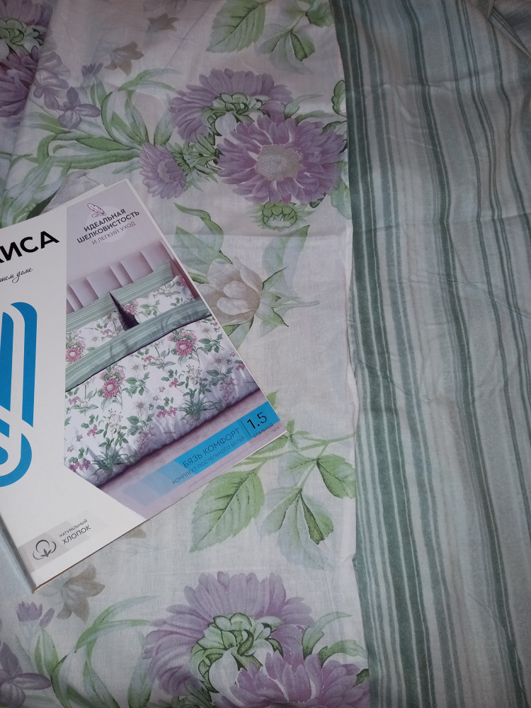 Комплект в принципе нормальный. Мягкий на ощупь. Но, мне не понравилась цвет простыни, с полосками. Раз комплект называется "Ботаника" могли бы в простыни нарисовать цветы или что-то ещё какие-то ботанические рисунки. А так ничего...