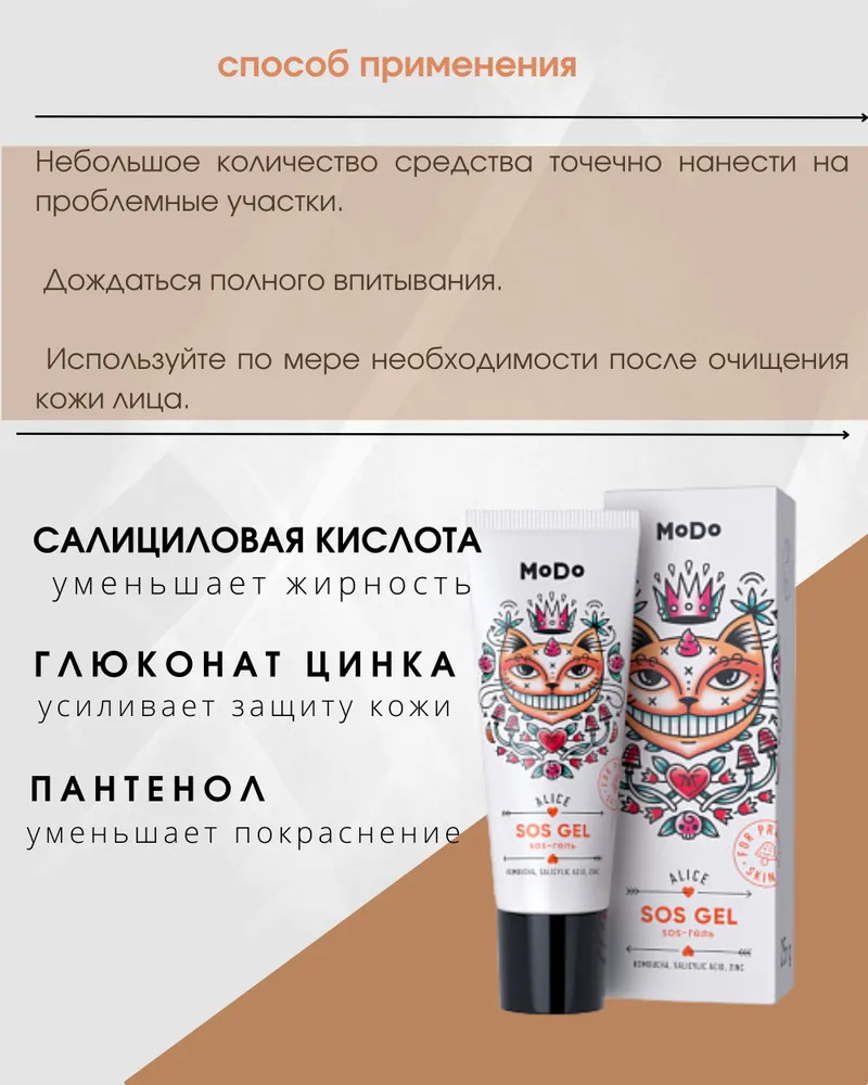 💳 Оплатить за товар можно при получении 🇰🇿 Есть бесплатная доставка по Казахстану от 1 дня 🎁 Копите бонусы с каждой покупки Серия: Modo Alice SOS-гель Modo Alice для проблемной кожи — гель для локального применения, эффективное и удобное средство. |