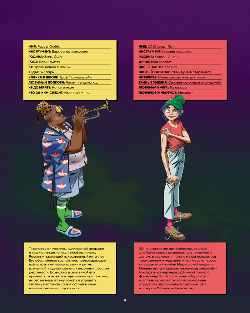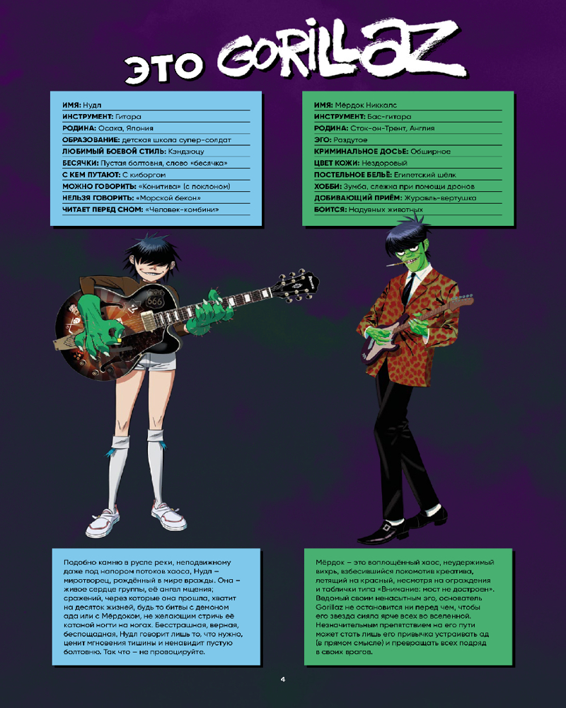 Знали ли вы, что Мёрдок, основатель группы и непревзойдённый бас-гитарист, в своё время написал мемуары? В этой книге вас ждёт сочный отрывок из этого гримуара! Расс, как истинный киноман, расскажет о своих любимых фильмах! Нудл во всех подробностях промурлычет о музыке, помогающей ей устраивать бойню (музыкальную, конечно), а 2D проведёт мастер-класс по... штанам?! Да уж, от этого квартета всего можно ожидать!