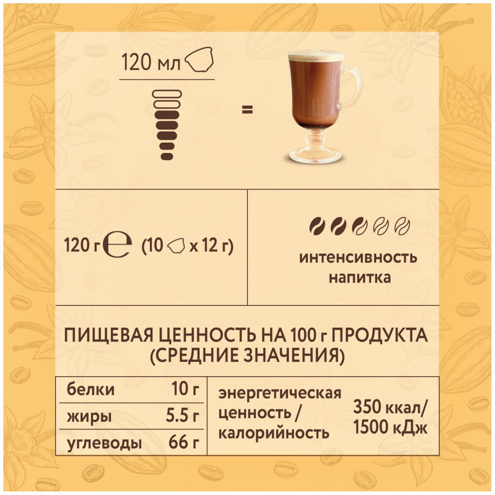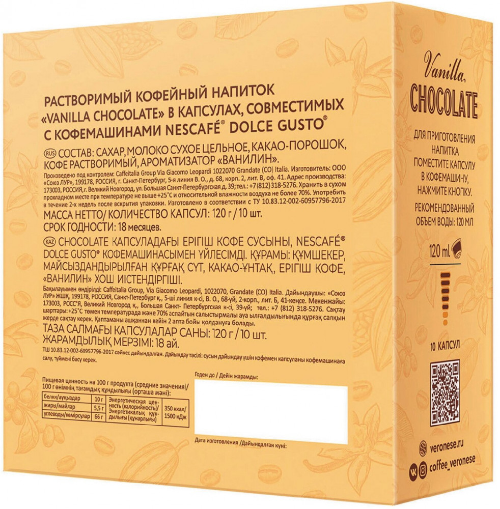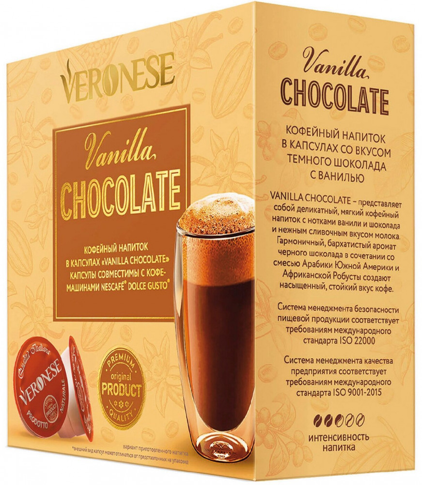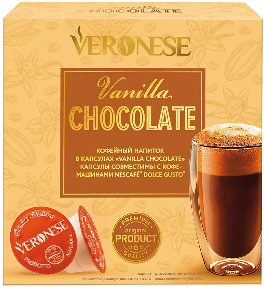 Vanilla Chocolate представляет собой деликатный, мягкий кофейный напиток с нотками ванили и шоколада и нежным сливочным вкусом молока. Гармоничный, бархатистый аромат черного шоколада в сочетании со смесью арабики Южной Америки и африканской робусты создают насыщенный, стойкий вкус кофе. Капсулы, совместимые с кофемашинами Nescafe Dolce Gusto (Дольче Густо). Рекомендованный объем воды — 120мл (5 делений).