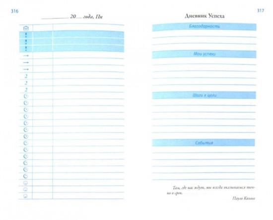 Регулярно заполняя «Дневник Успеха», ты сможешь: определиться с целями и составить план их реализации; правильно расставлять приоритеты; извлекать уроки из ситуаций и принимать взвешенные решения; видеть и использовать возможности, которые дарит тебе жизнь; стать тем, кем ты всегда мечтал быть. |